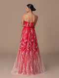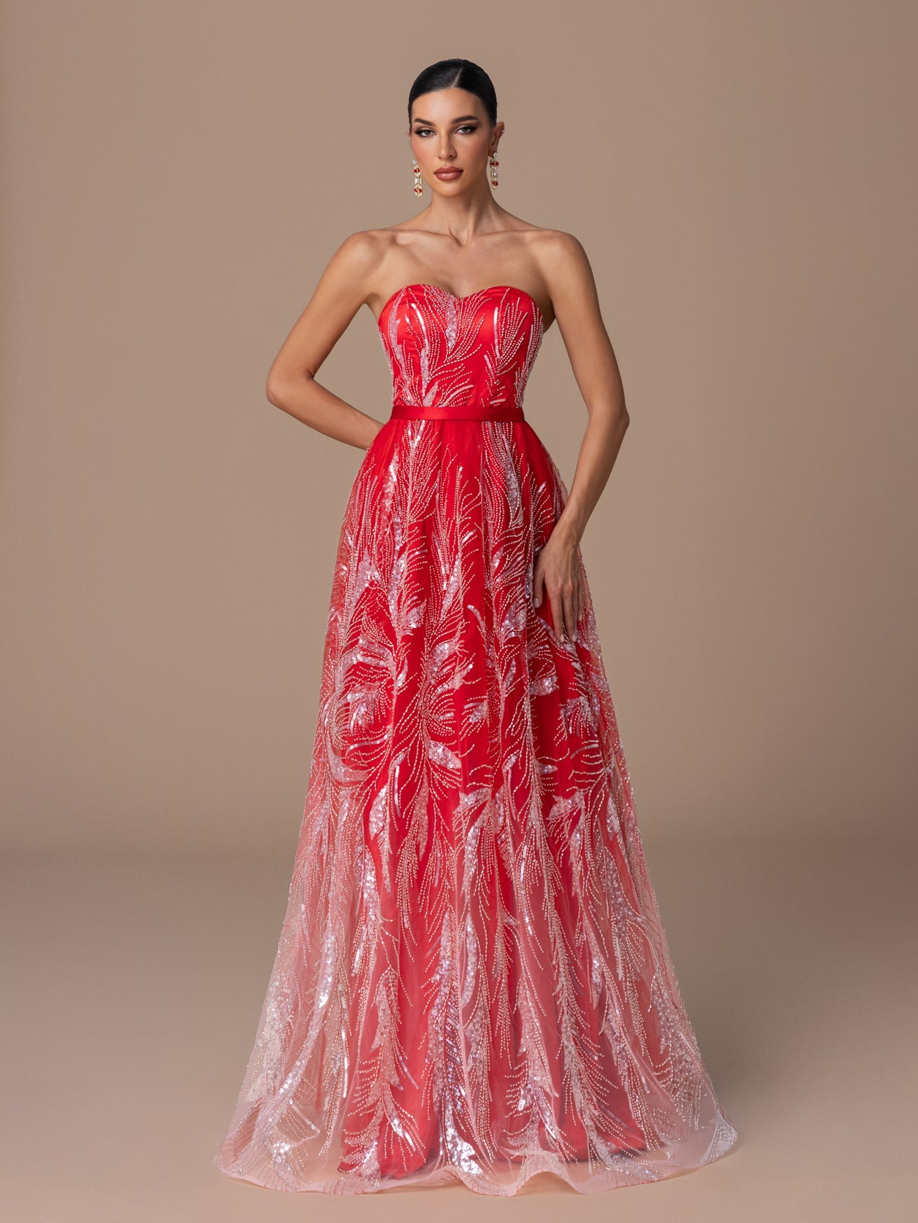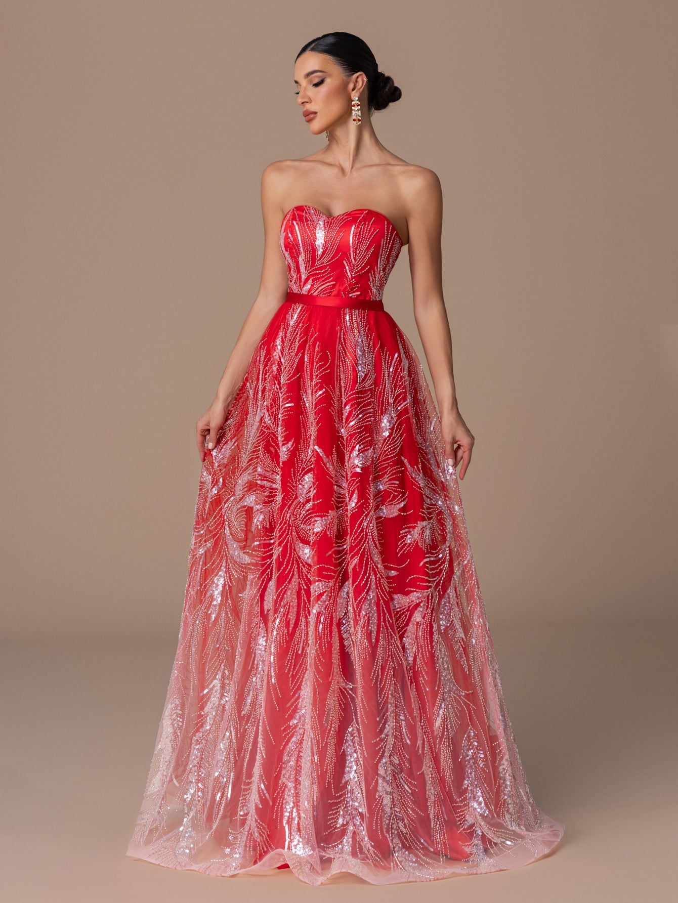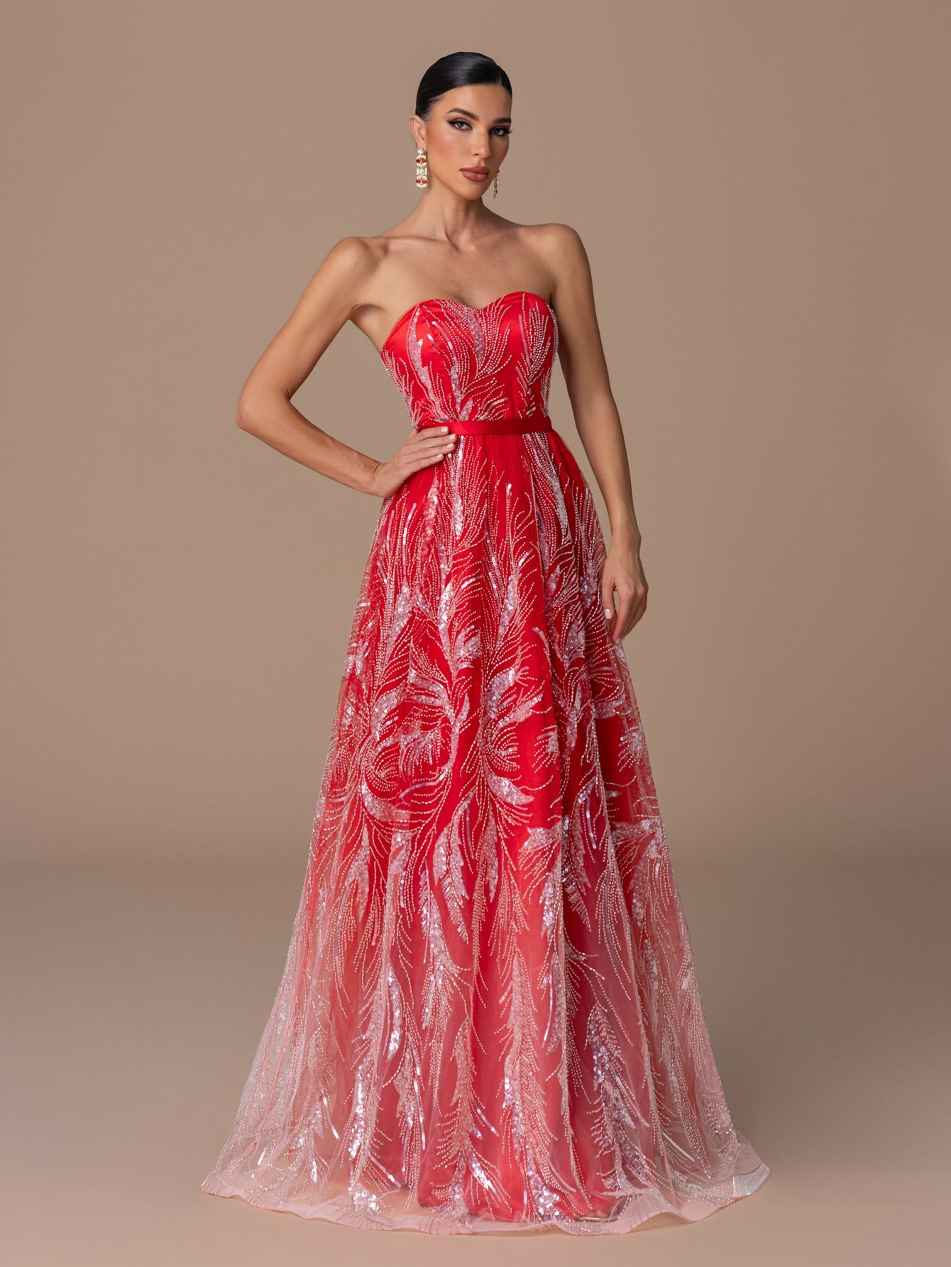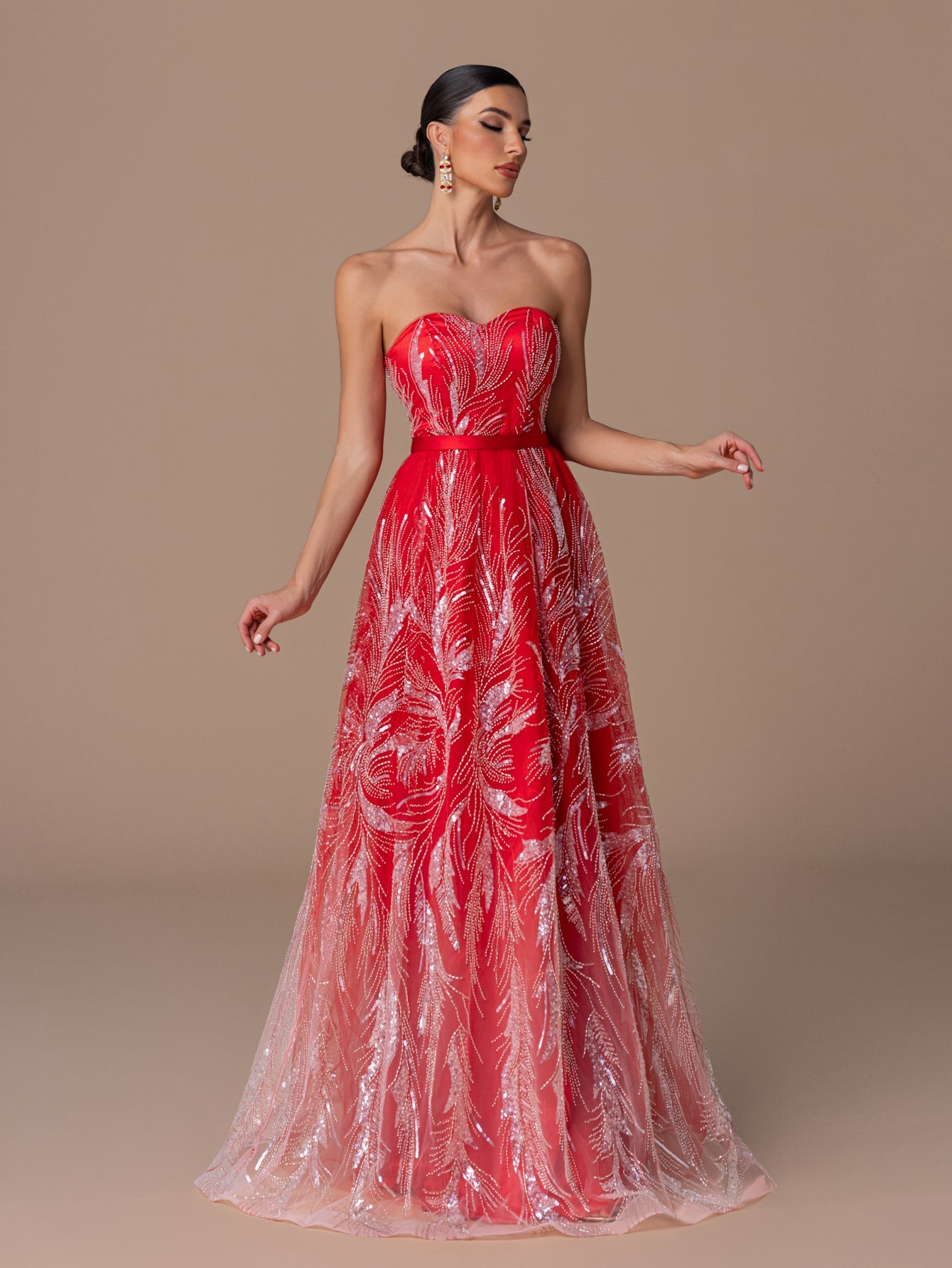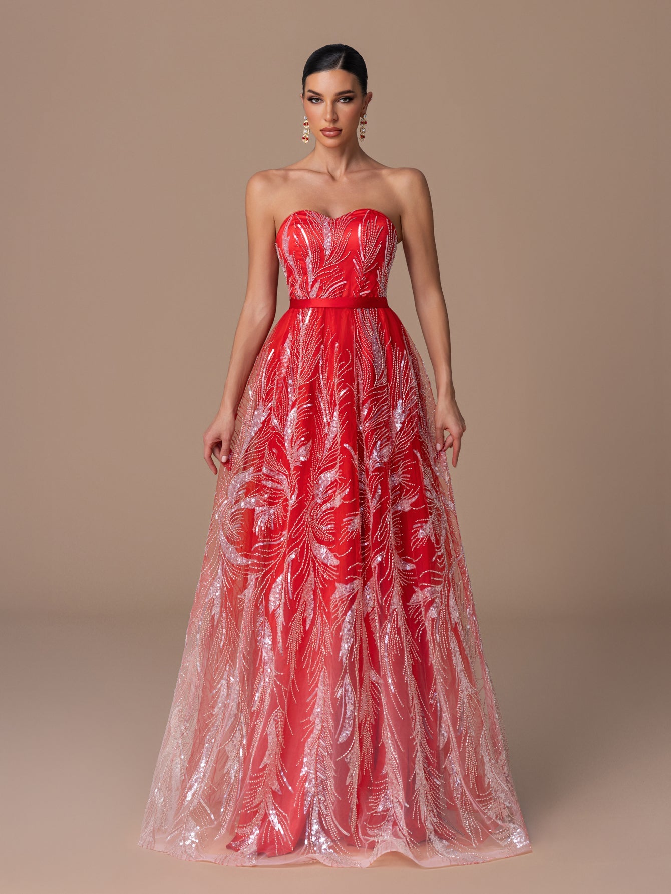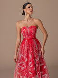 Strapless Gown with Heart-Neck Sequin Embroidery, A-Line Skirt & Crisscross Back Ties