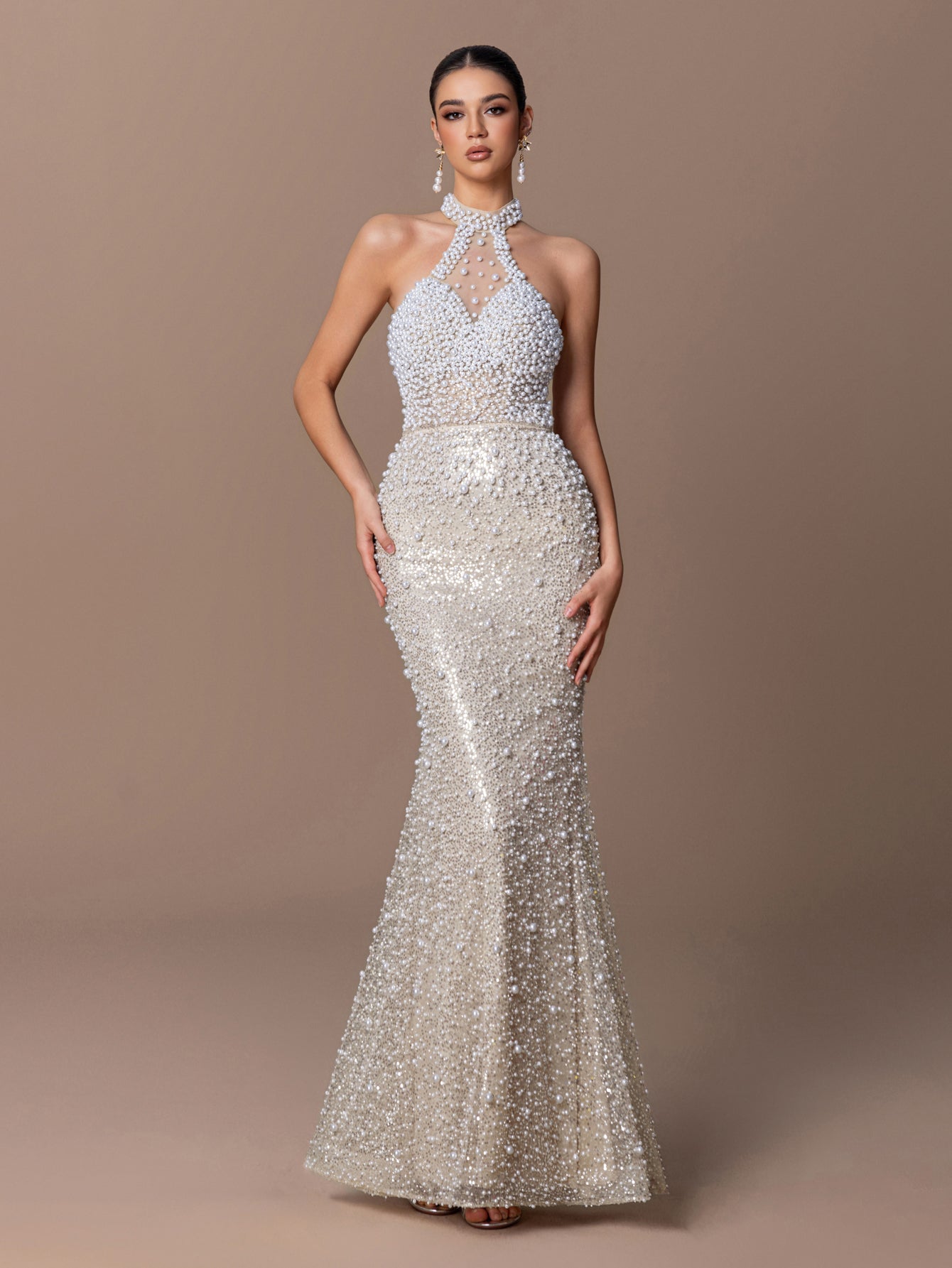 Halter Neck Mermaid Gown with Pearls, Sequins, High Collar & Fish-Tail Silhouette