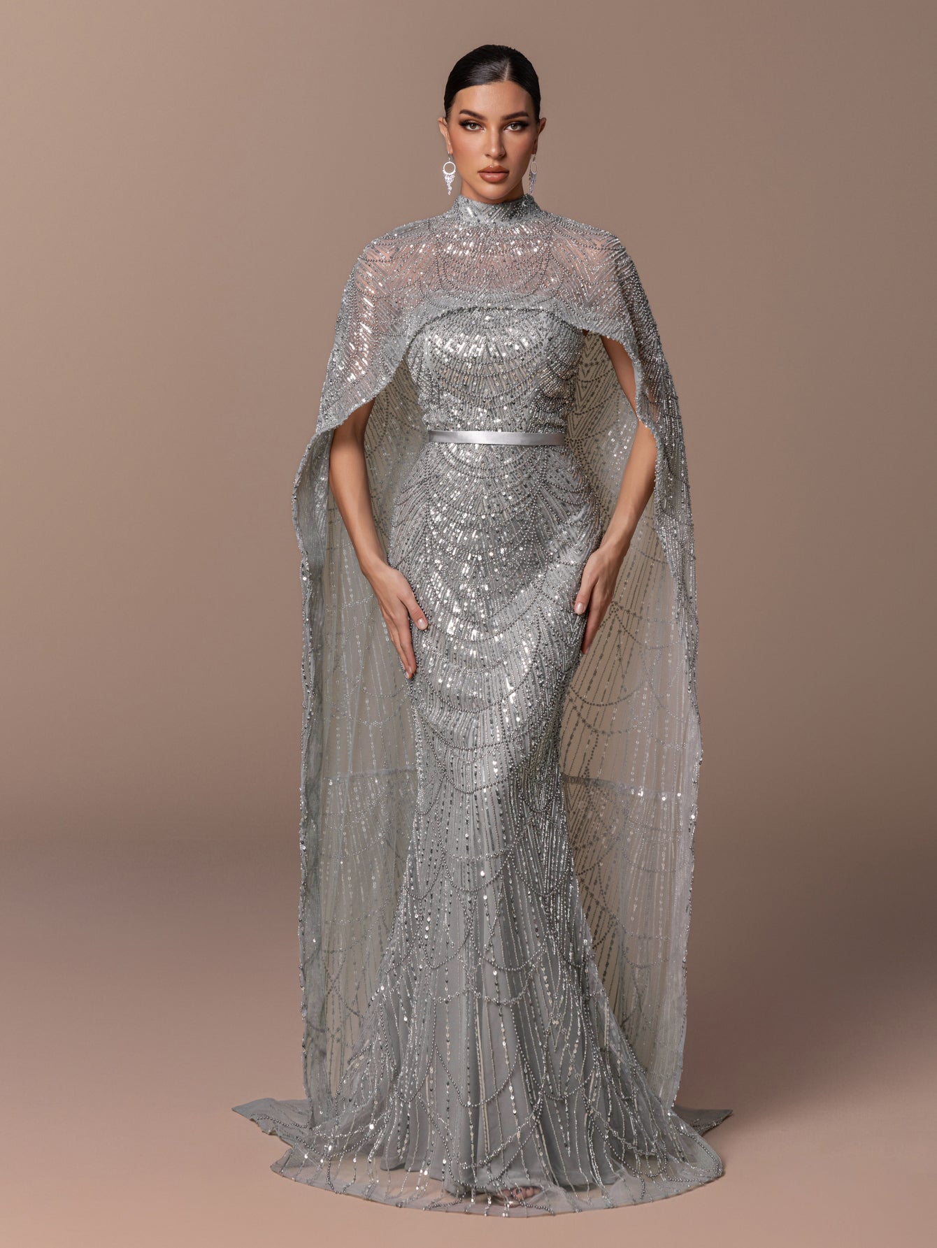 High-Neck Mermaid Gown with Beaded Sequins, Geometric Patterns & Cape Train