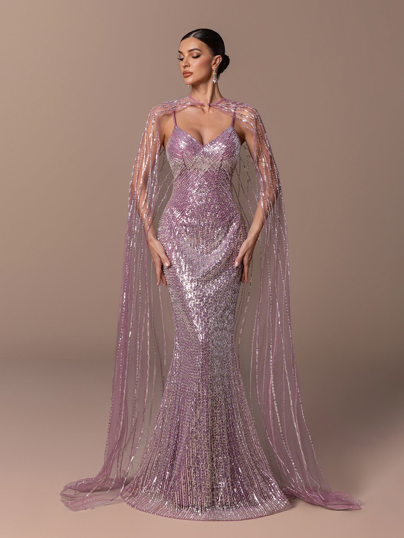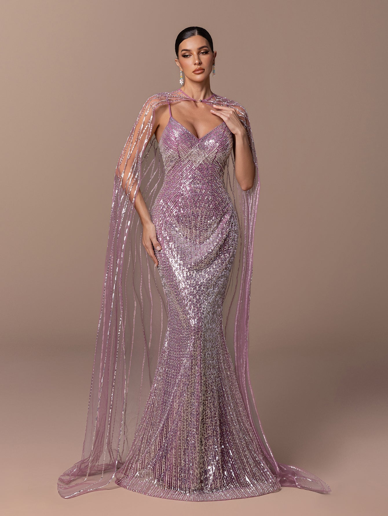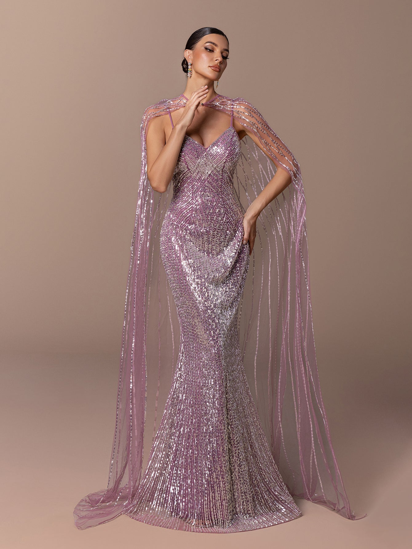 Spaghetti Strap Deep V-Mermaid Gown with Tulle Cape & Sequined Details