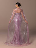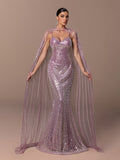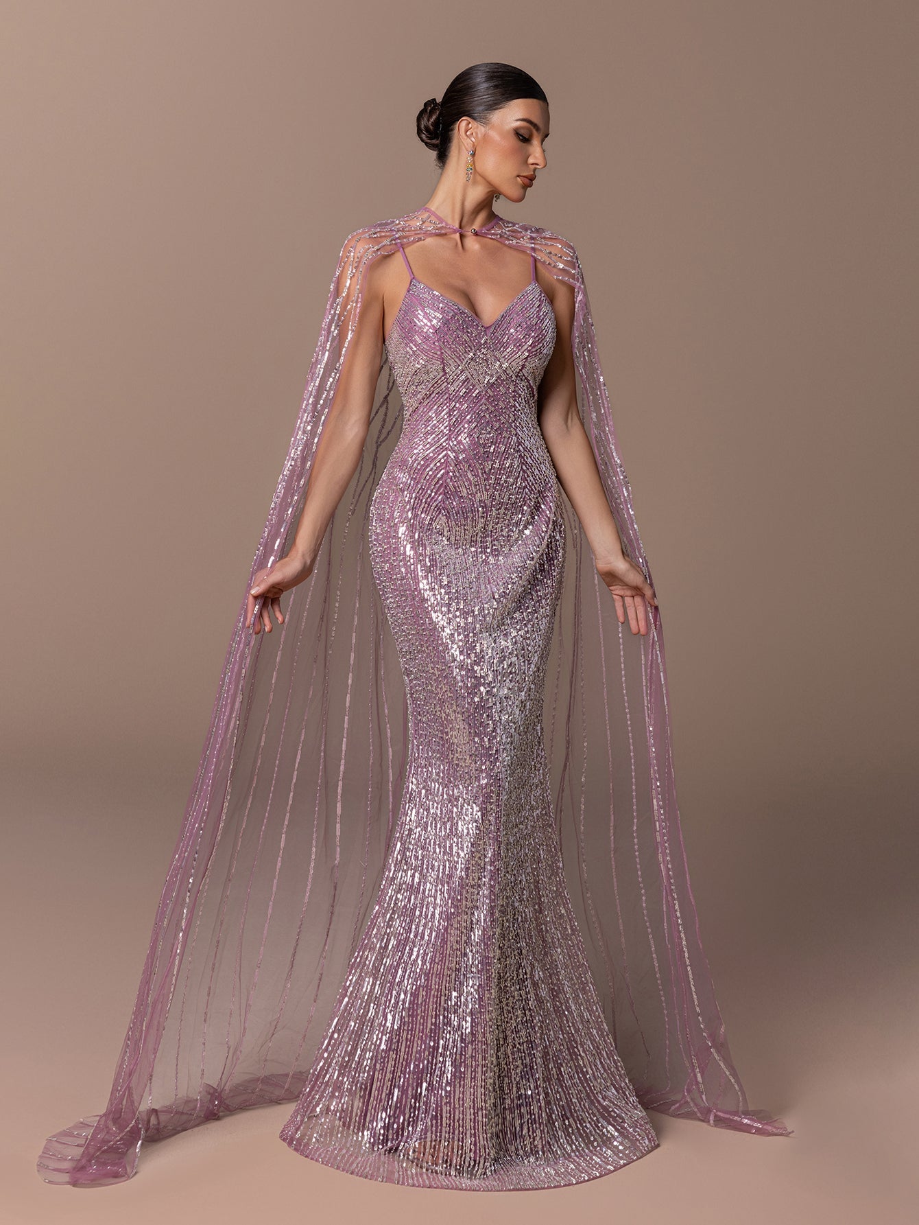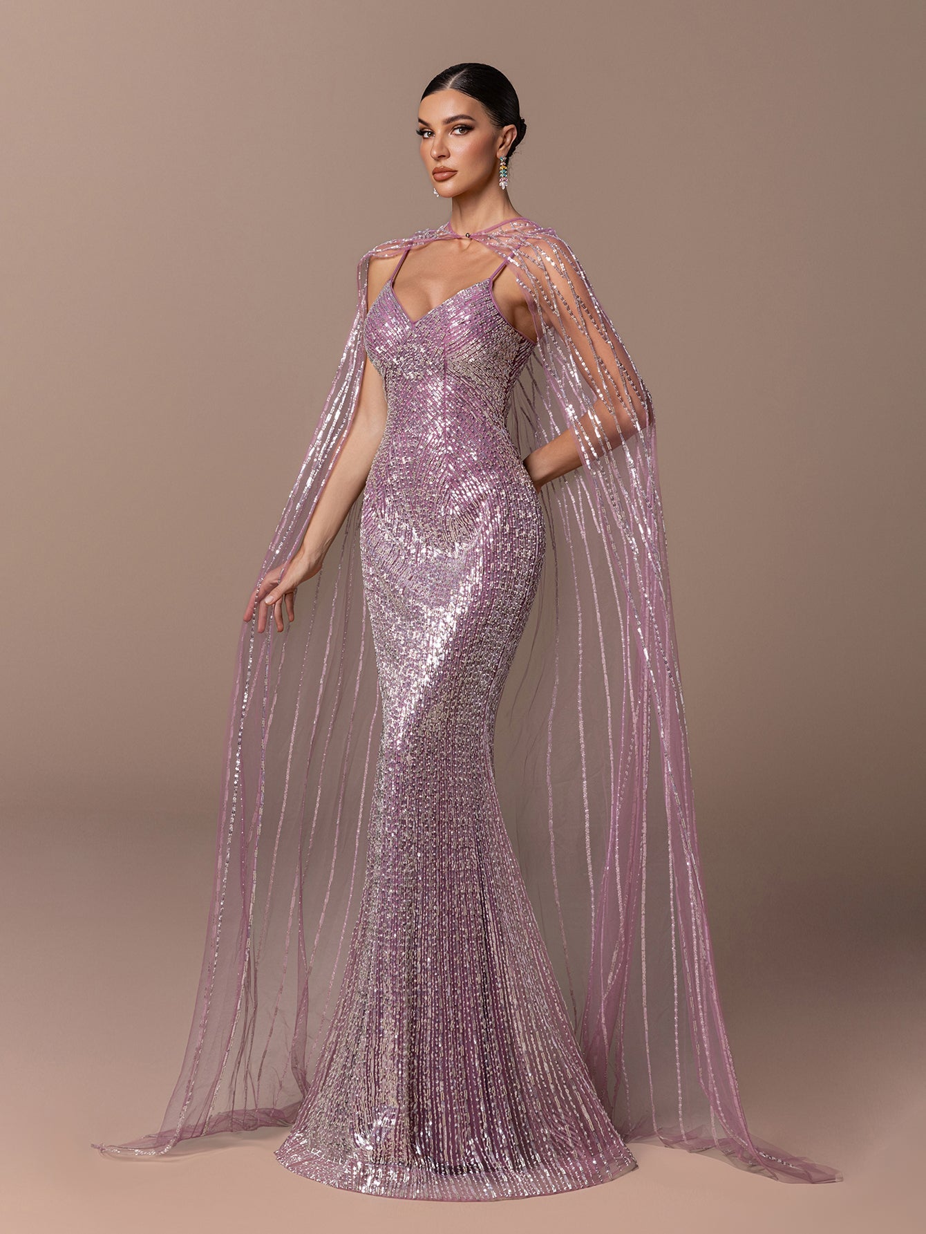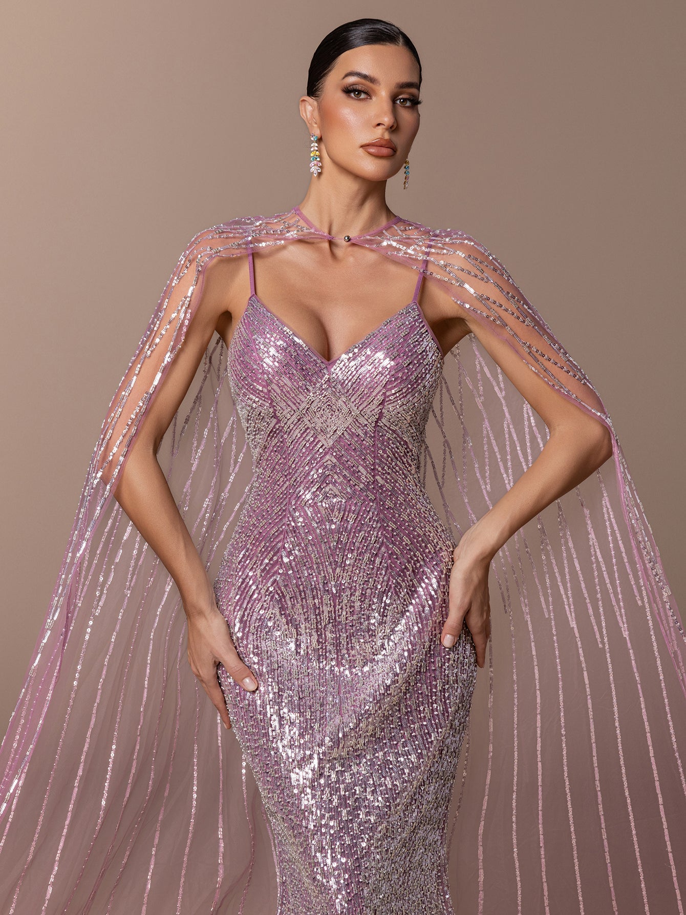 Spaghetti Strap Deep V-Mermaid Gown with Tulle Cape & Sequined Details