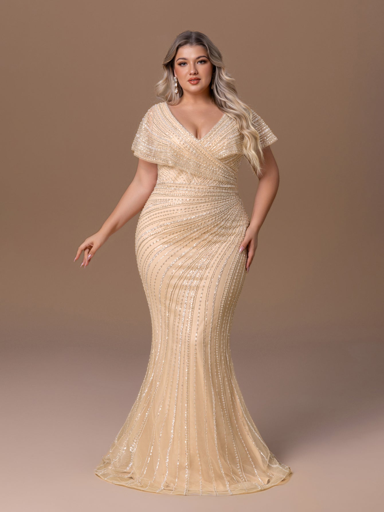 Plus Mermaid Gown with Vertical Sequin & Bead Stripes, V-Neck Cape-Shoulder Short Sleeves