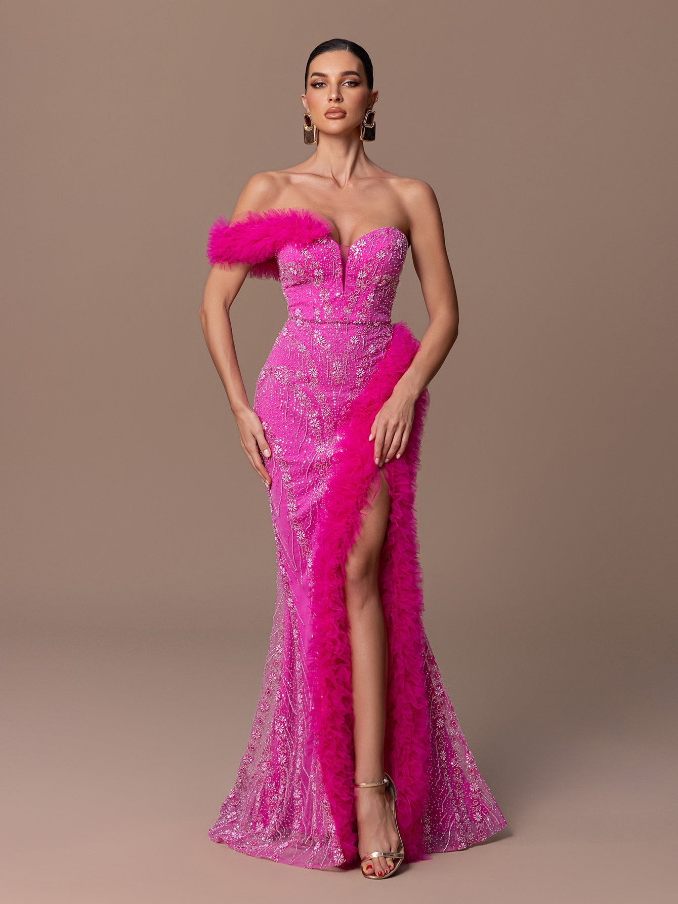 One-Shoulder Mermaid Gown with Ruffle Trim Accents, Beaded Sequins & High Slit