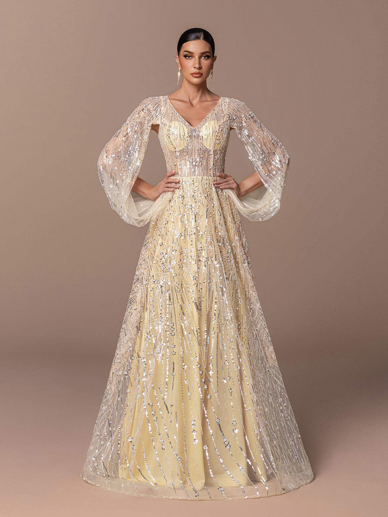Floor-Length V-Neck Slit Sleeves Gown with Beaded Sequins