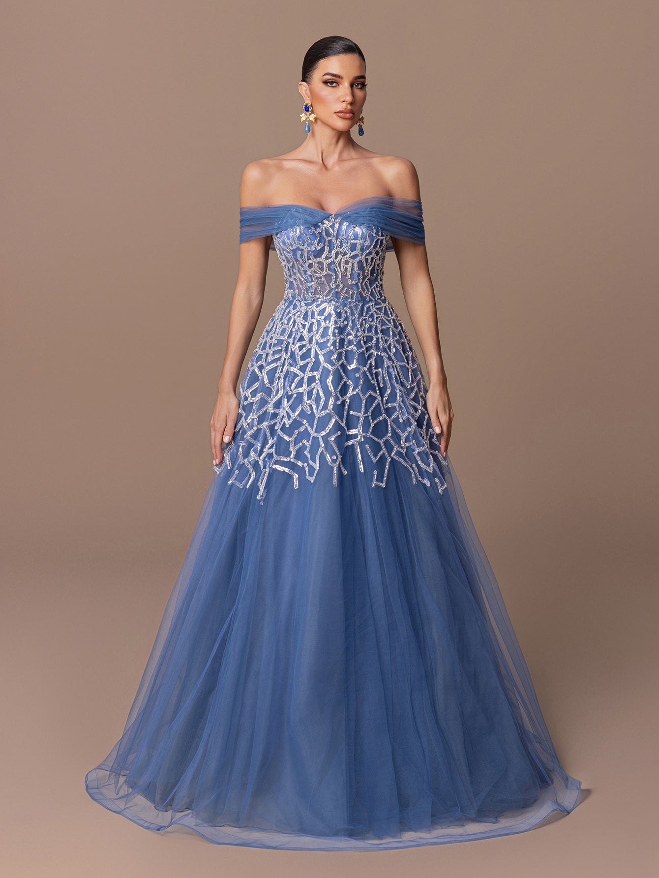Off-Shoulder A-Line Gown with Sequined Geometric Embroidery, Tulle Skirt & Open Back