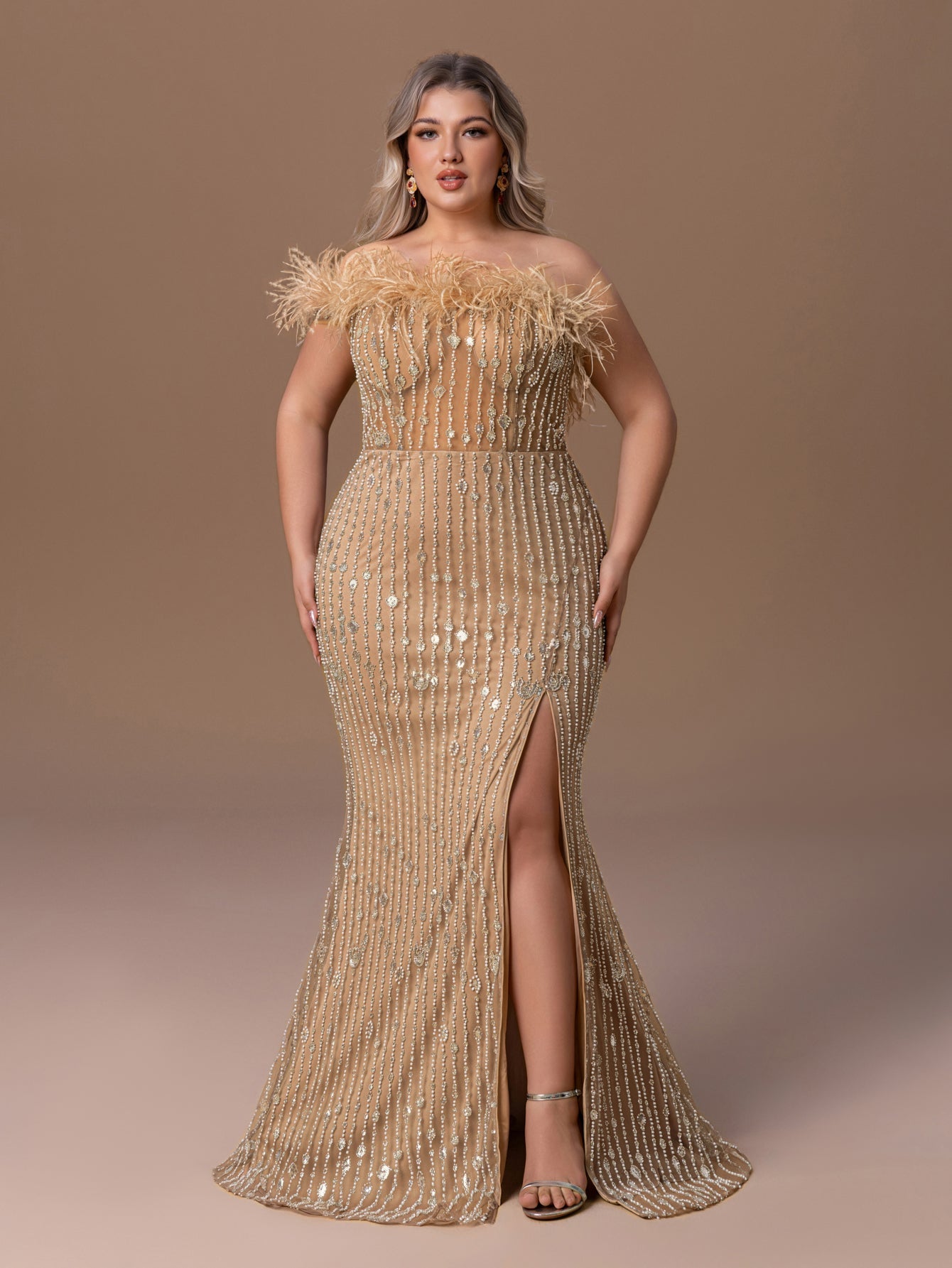 Plus Strapless Mermaid Gown with Feathers, Beaded Sequins & High Slit