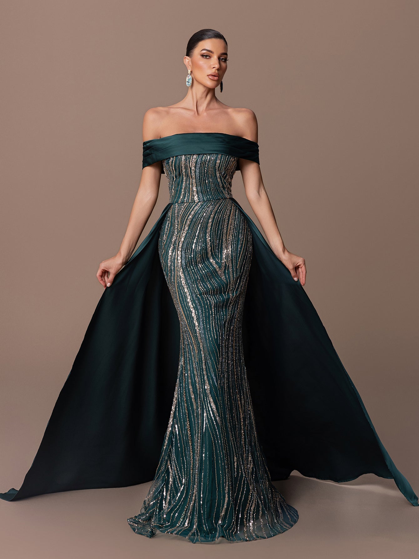 Off-Shoulder Mermaid Gown with Beaded Sequins & Satin A-Line Train