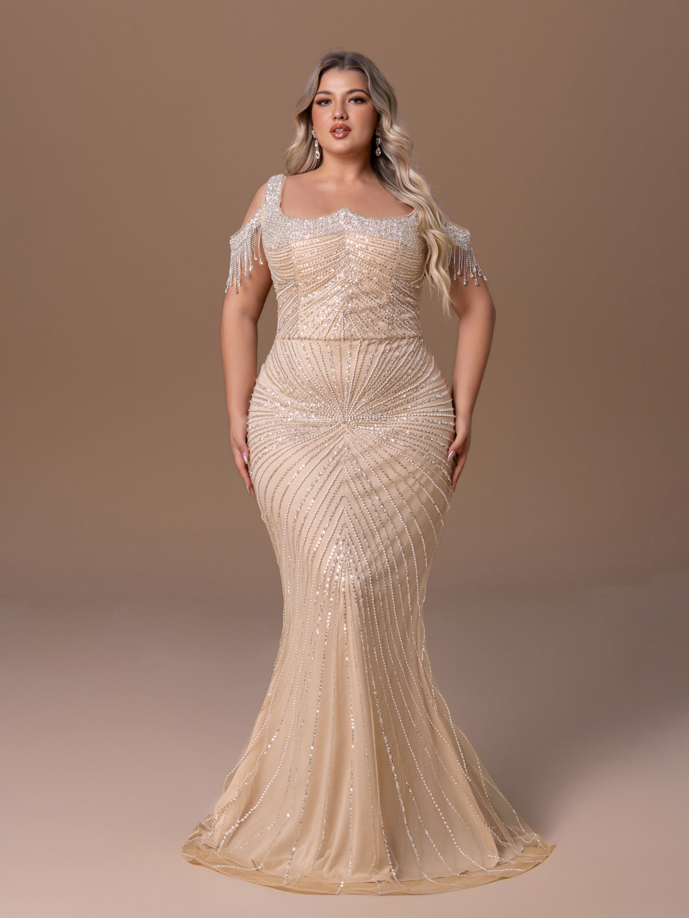 Plus Mermaid Gown with Square Neck, Beaded Sequins and Tassel Straps