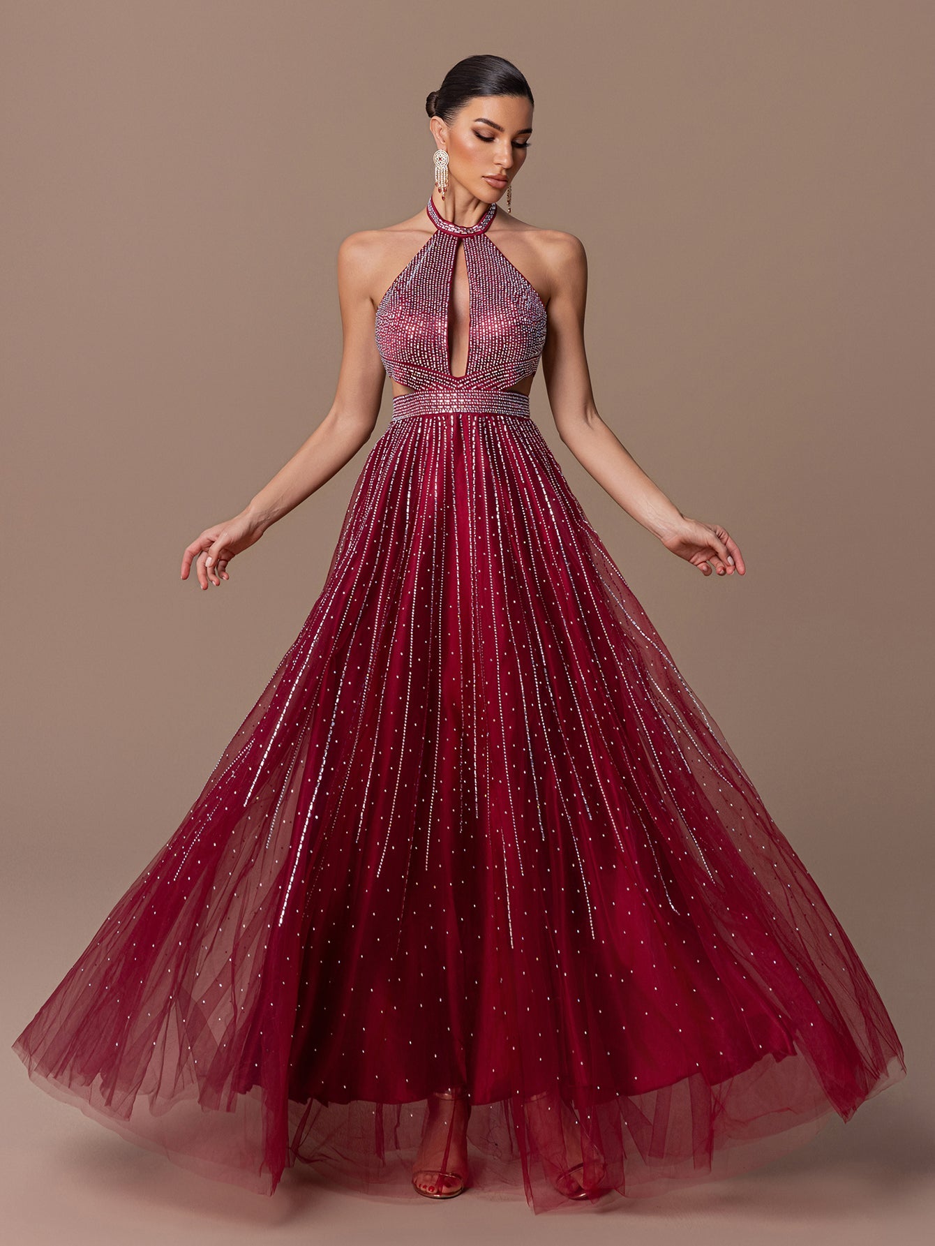Halter Neck Maxi Gown with Rhinestones & Multi-Layered Tulle