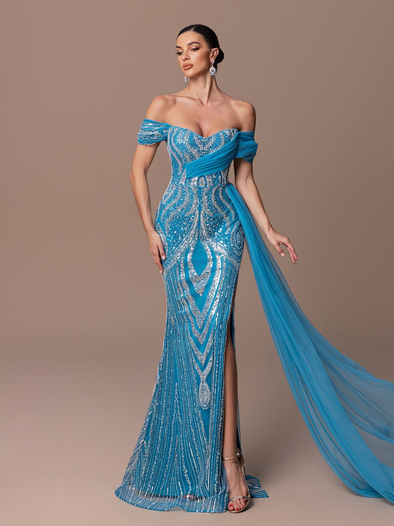 Off-Shoulder Mermaid Gown with Beaded Sequins, High Slit & Tulle Train