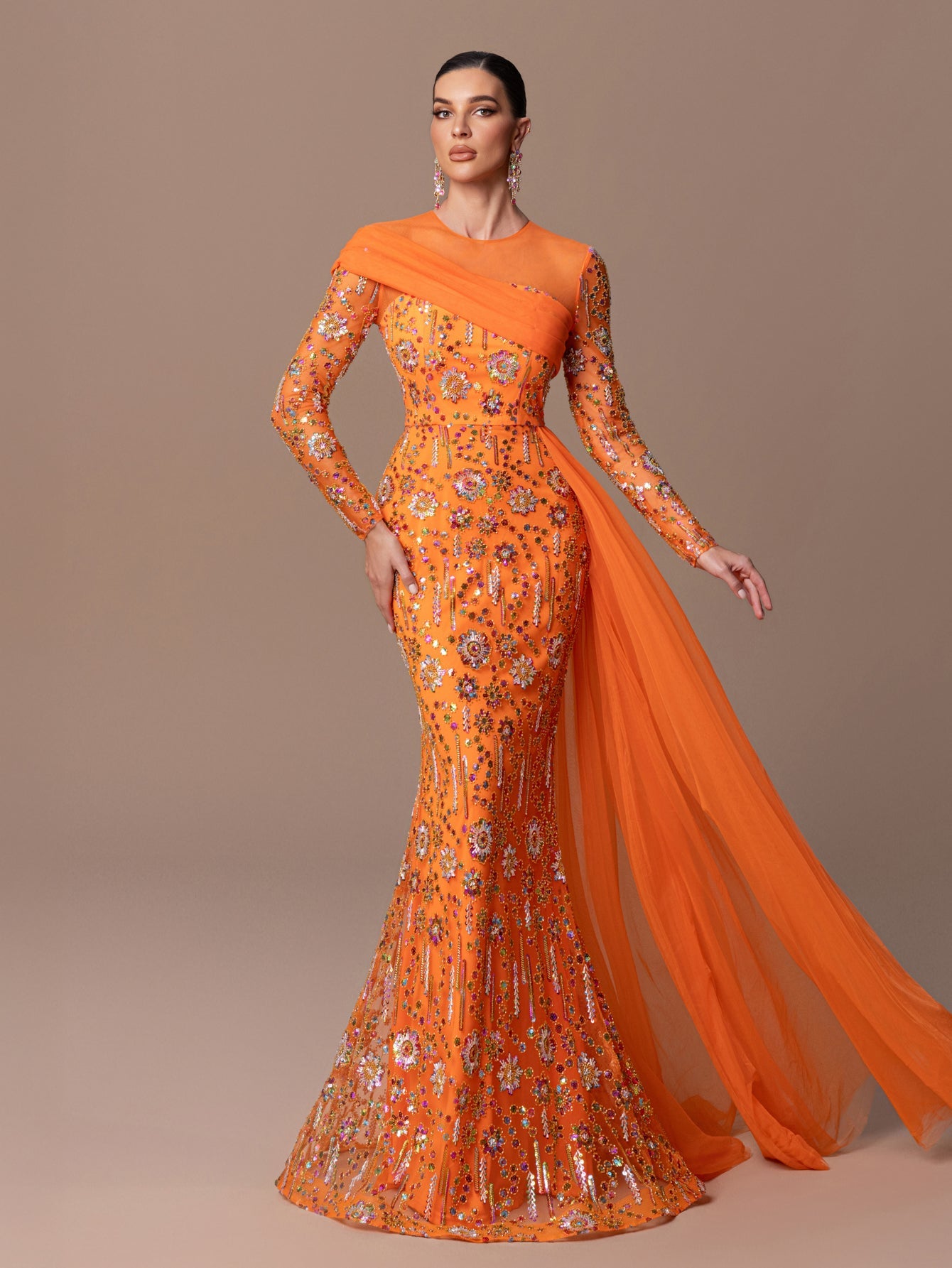 Beaded Mermaid Gown with Embroidered Sequin & Tulle Overlay