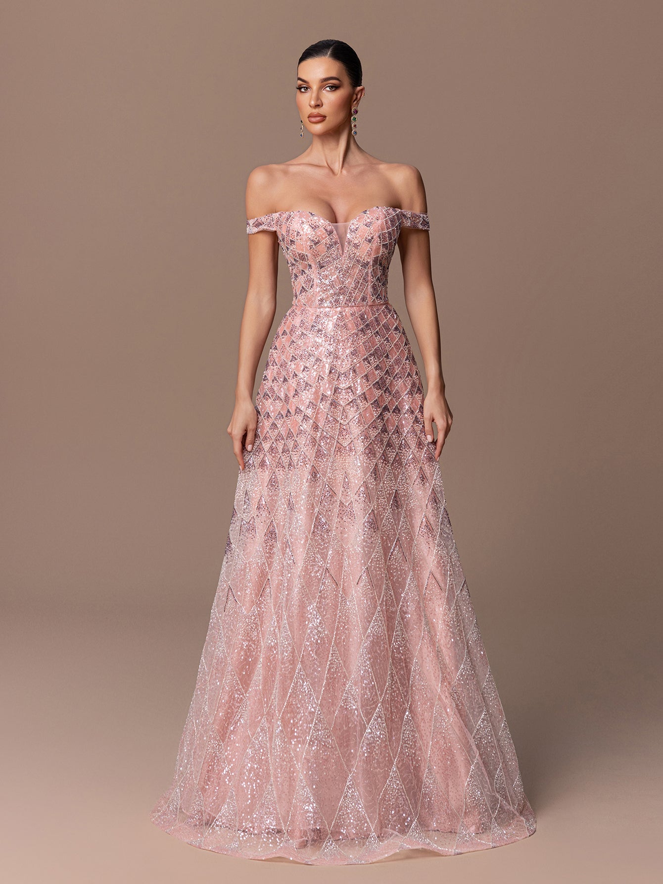 Off-Shoulder Sparkling Gown with Geometric Patterns & Lace-Up Back