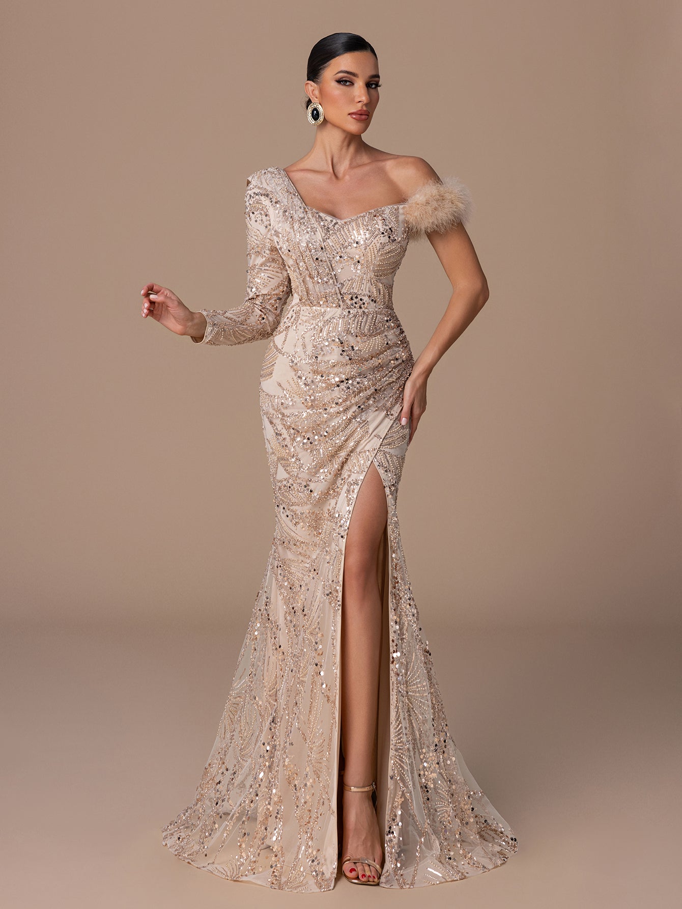 One-Shoulder Mermaid Gown with Fluffy Feathers, Sequins & High Slit
