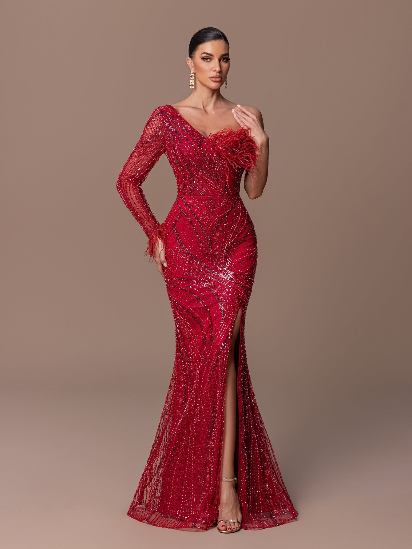 One-Shoulder Mermaid Gown with Beaded Sequins, Feathers & Crisscross Back Tie