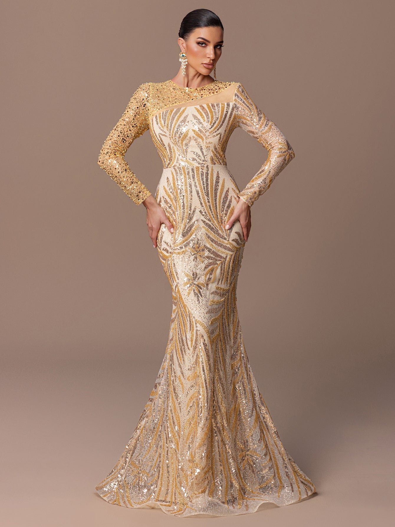 Mermaid Gown with Beaded Sequins, Sheer Long Sleeves