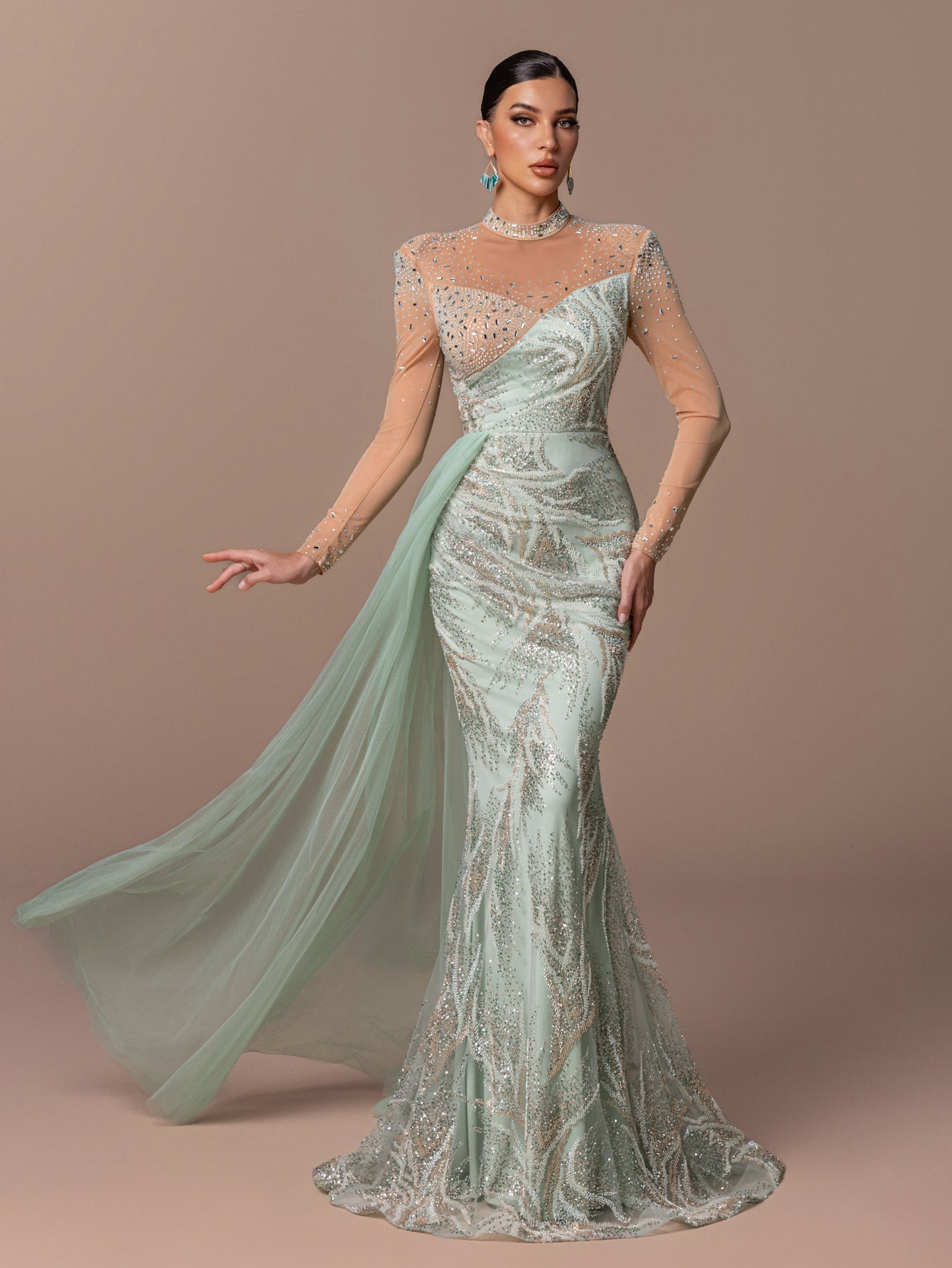 Mermaid Gown with Sheer Tulle, Sequins Embroidery & Tulle Train