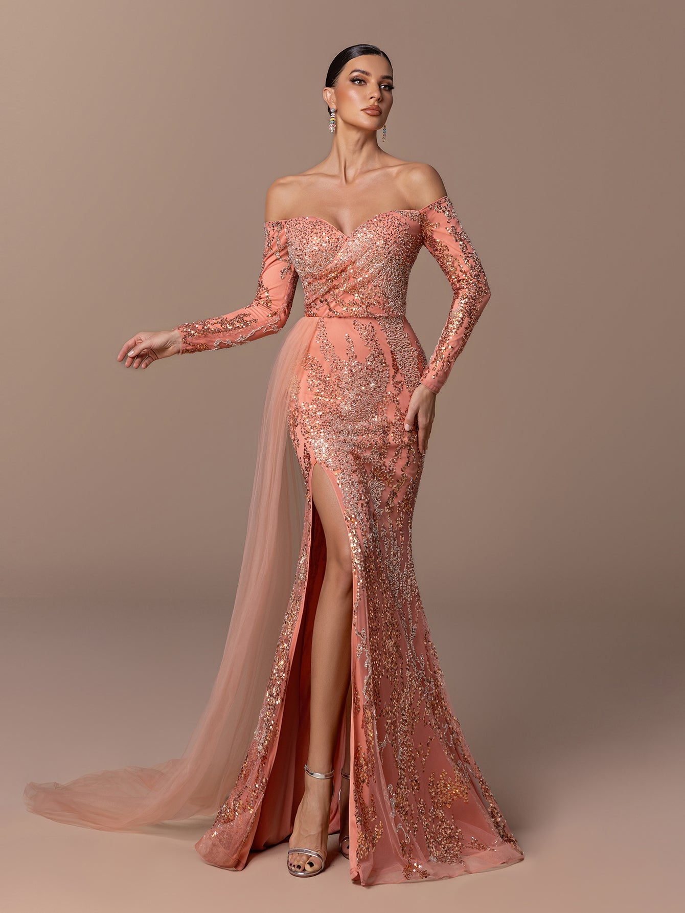 Off-Shoulder Long Sleeve Mermaid Gown with Beaded Sequins & Tulle Train