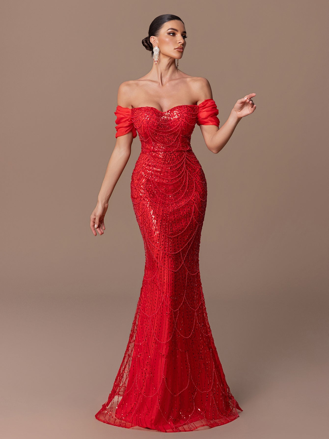 Off-Shoulder Mermaid Gown with Sequined Beads, Bubble Sleeves & Crisscross Back Tie