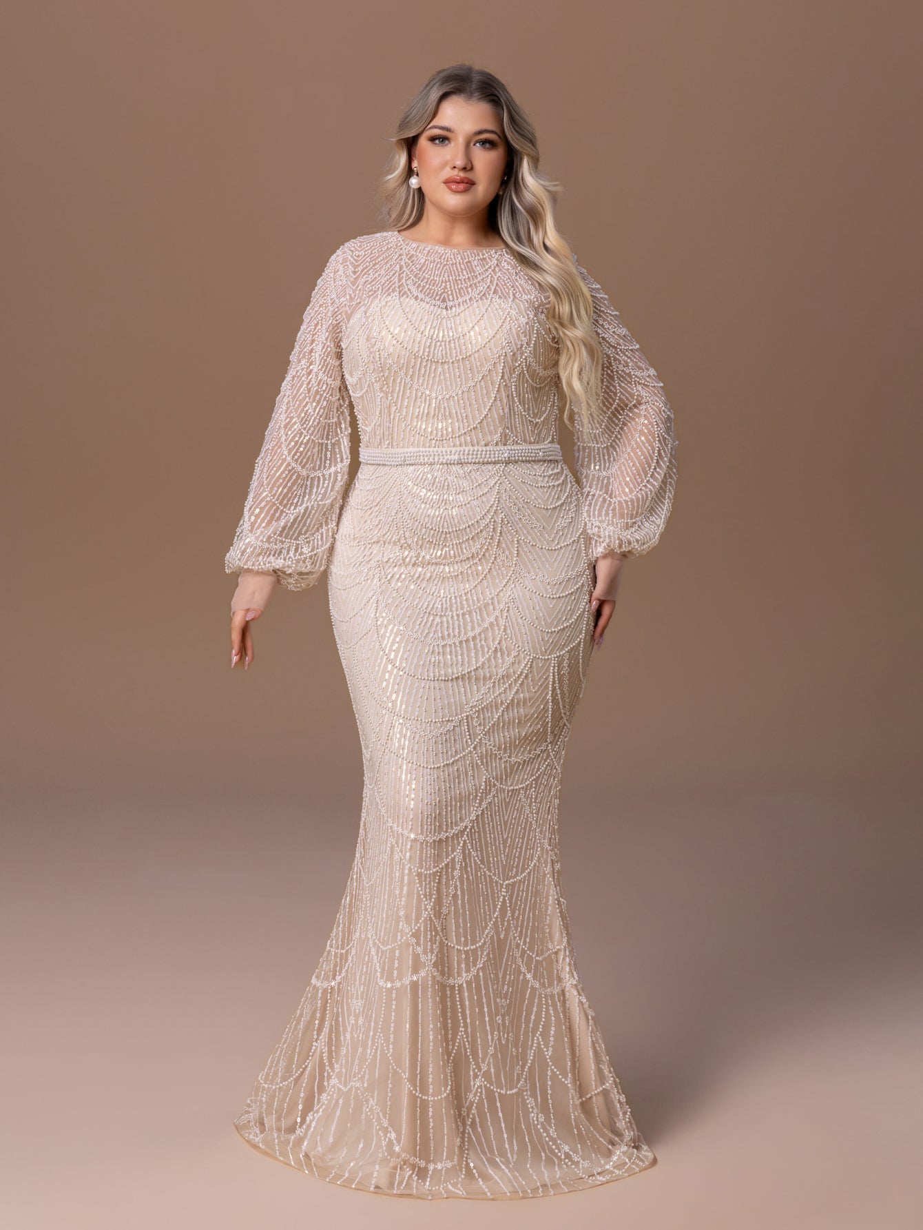 Plus Mermaid Gown with Beaded/Sequined Sheer Lantern Sleeves & Fish-Tail Silhouette