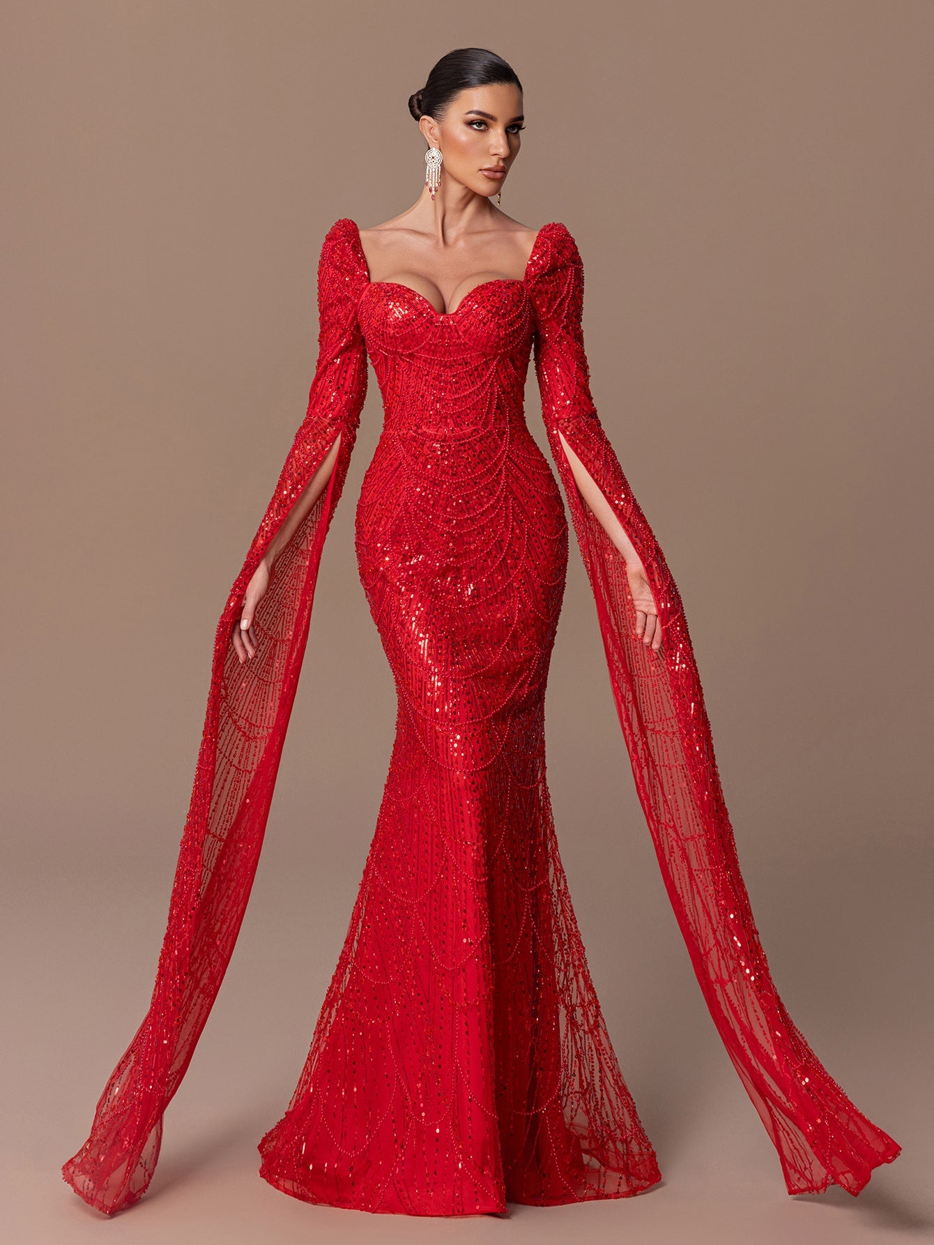 Sweetheart Neck Mermaid Gown with Extra-Long Sleeves, Sequins & Beads