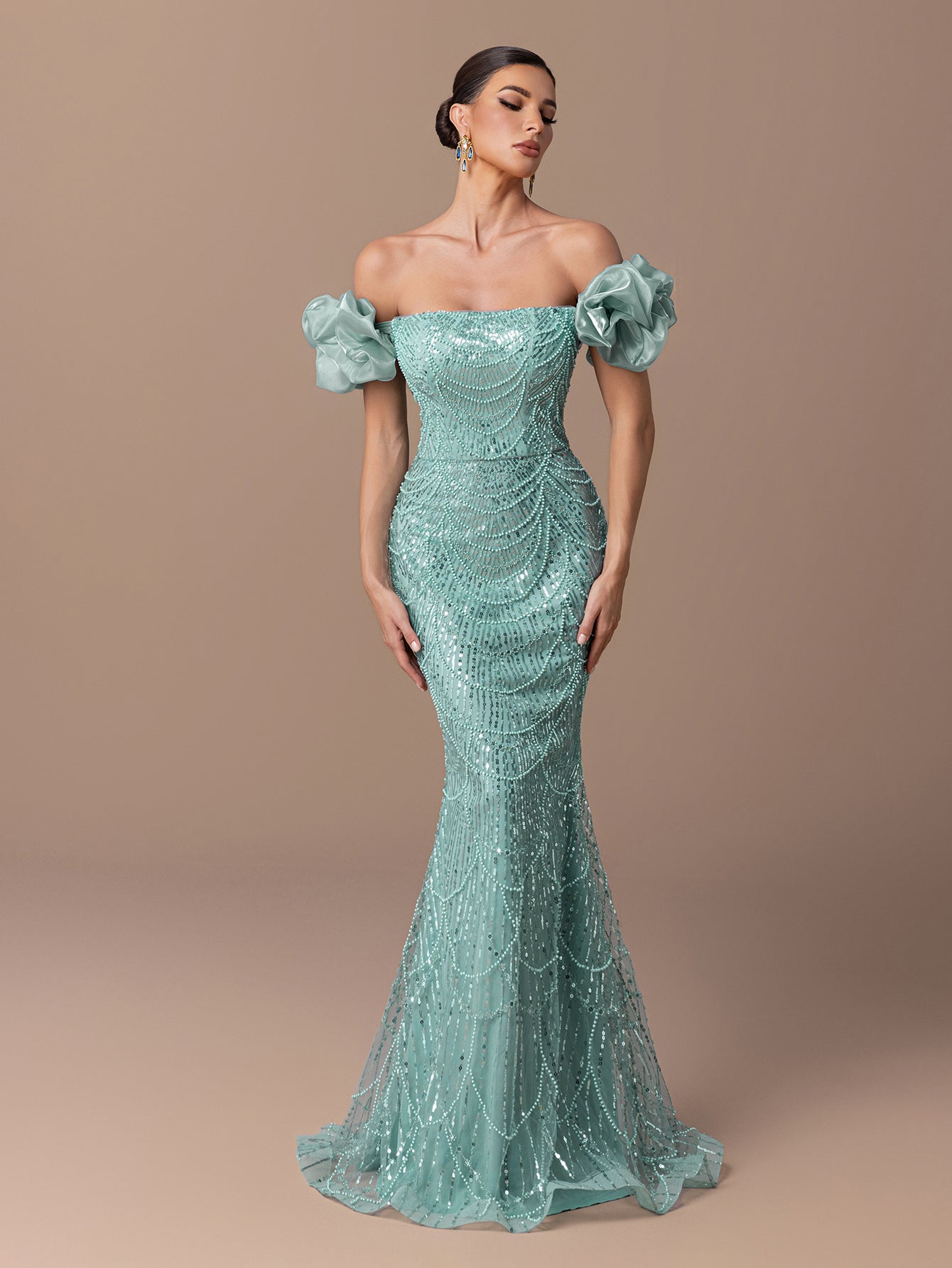 Off-Shoulder Mermaid Gown with Beaded Sequins & Crisscross Back Tie