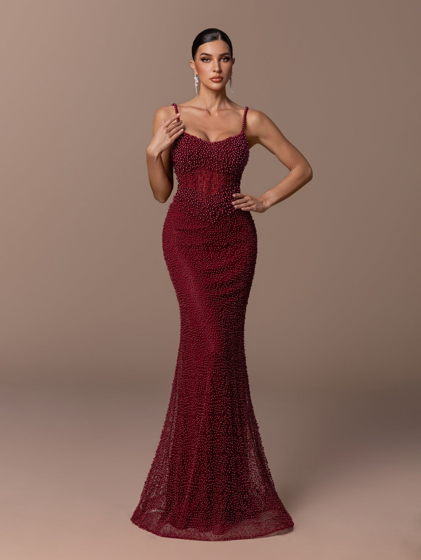 Thin Spaghetti Strap Mermaid Gown with Crisscross Tie & Beaded Embellishments