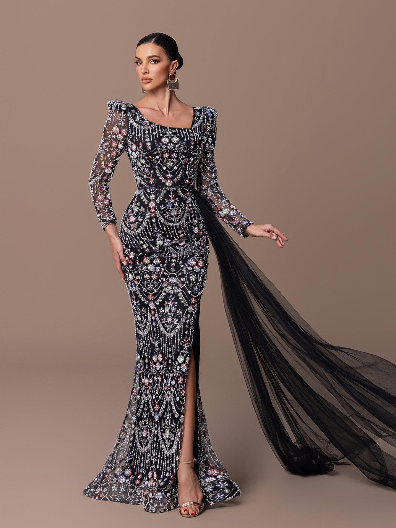 Mermaid Gown with Embroidered Floral Geometric Beads, Sheer Sleeves & Tulle Train