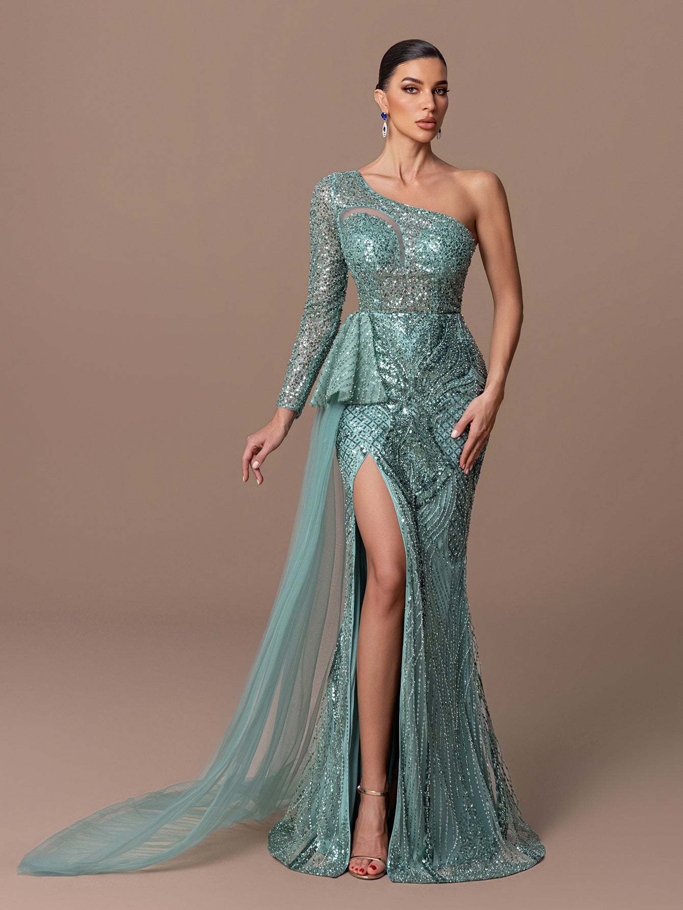 One-Shoulder Mermaid Gown with Sequins Beads & Tulle Train