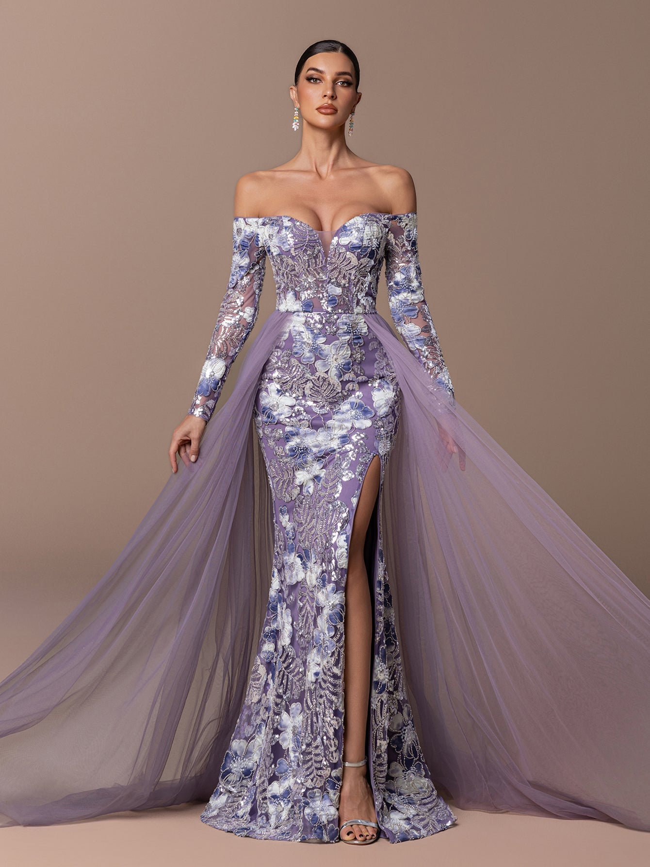 Off-Shoulder Long Sleeve Mermaid Gown with Floral Embroidery, Sequins & Crisscross Back