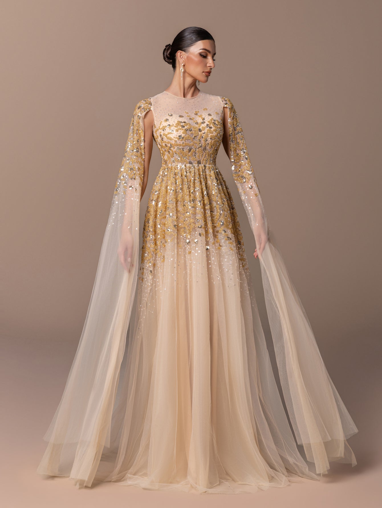 Tulle Floor-Length Gown with Beaded Sequins & Wide Cape Sleeves