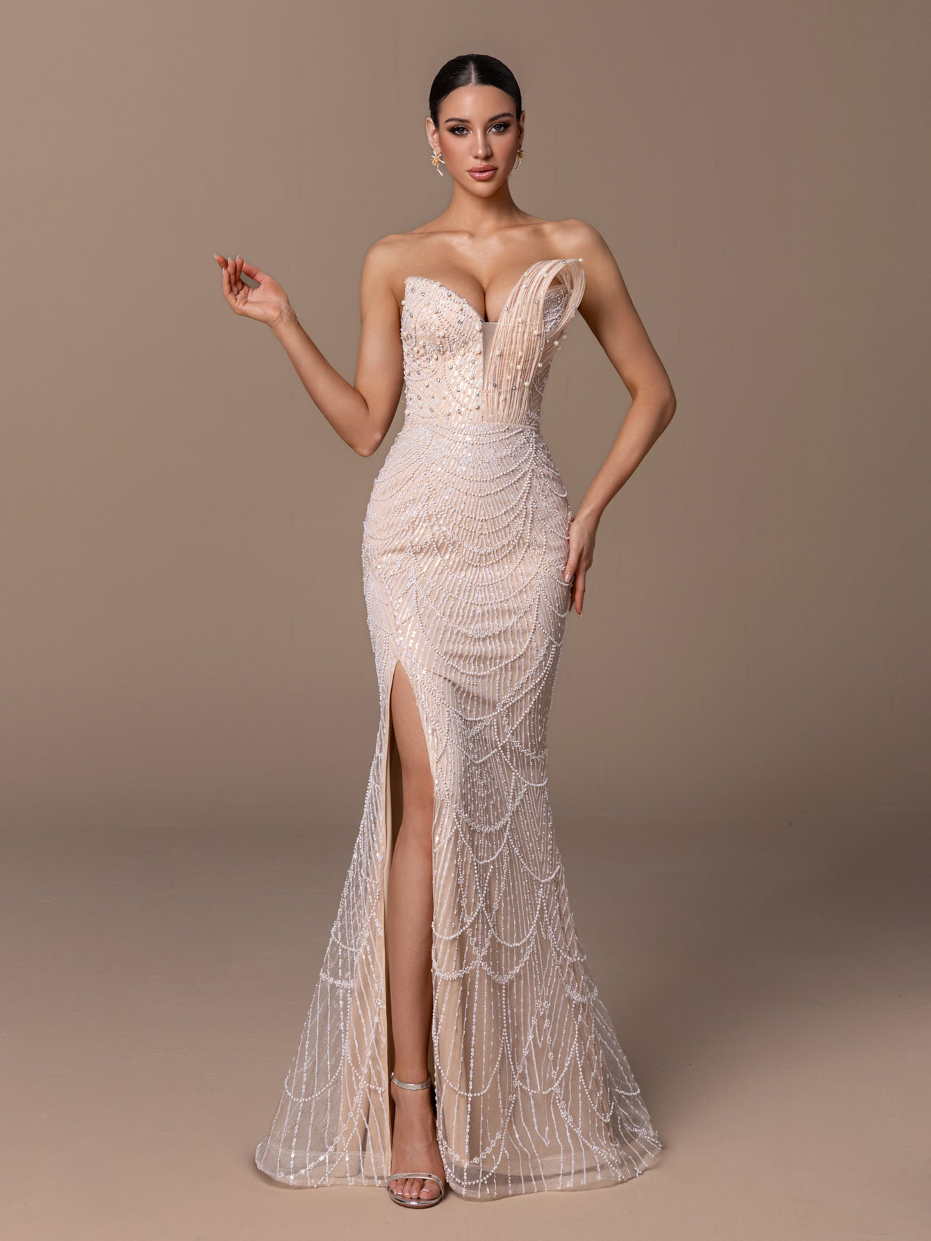 Strapless Mermaid Gown with Beaded Sequins & Crisscross Tie-Back