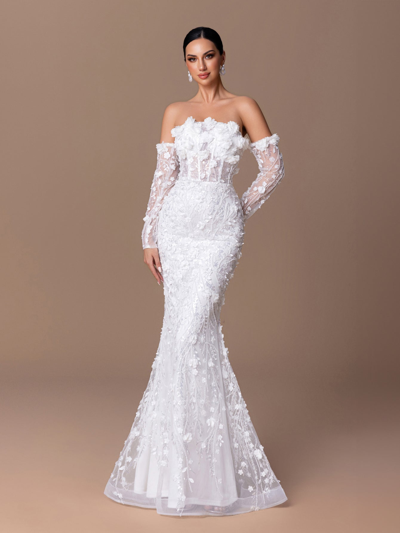 Off-Shoulder Mermaid Gown with 3D Floral Embroidery & Sheer Sleeves
