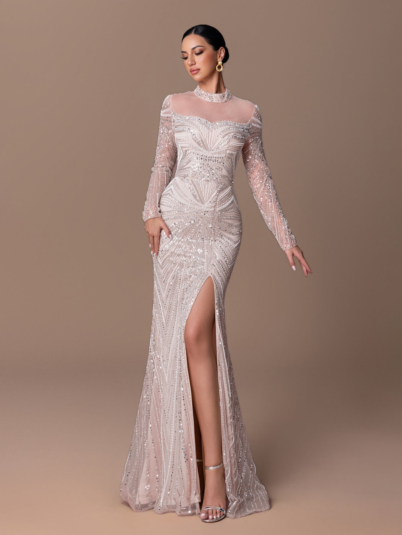High-Neck Long-Sleeve Mermaid Gown with Tulle, Beaded Sequins and Slit