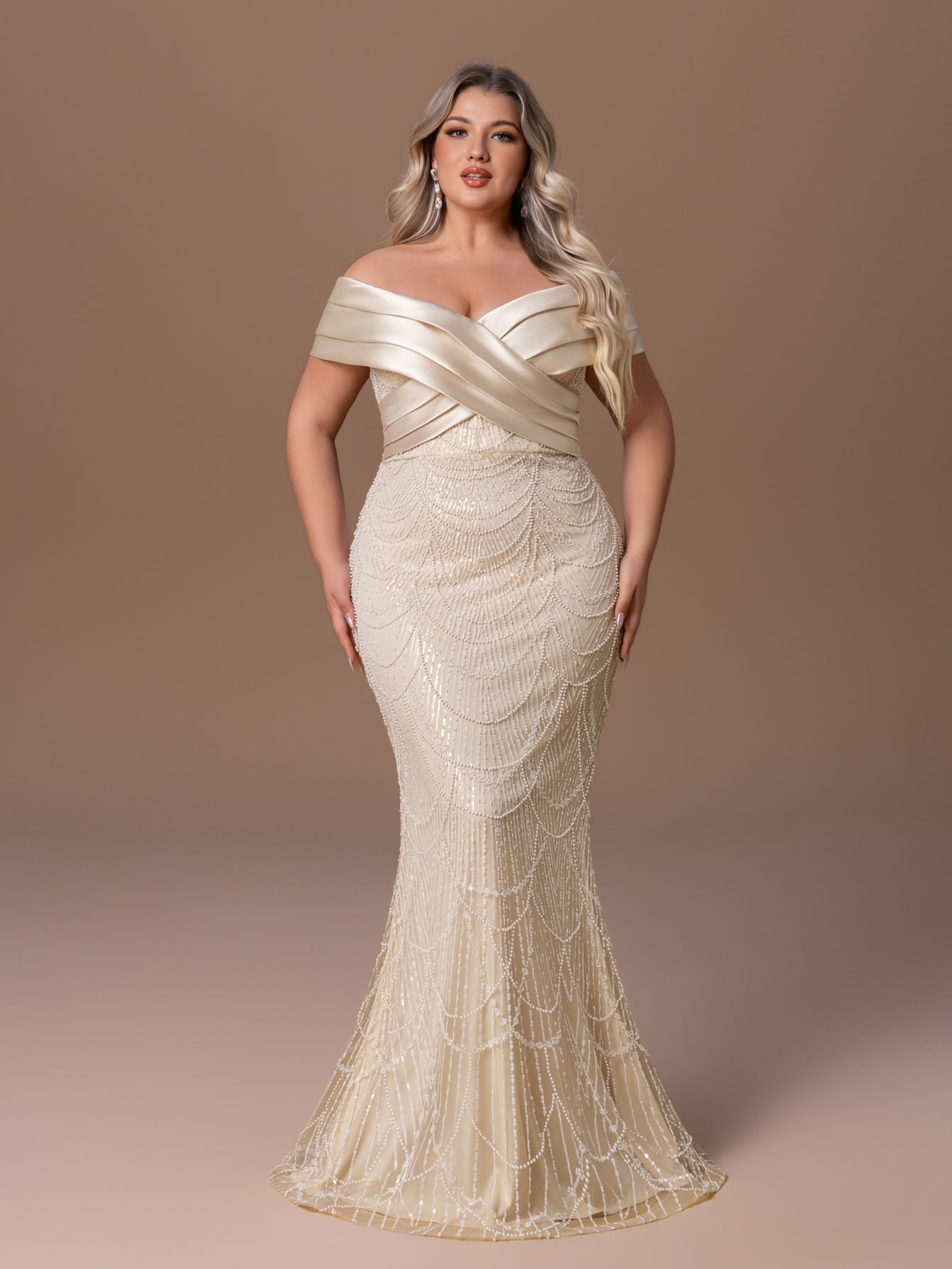 Plus Off-Shoulder Mermaid Gown with Beaded Sequin, Criss Cross Back Straps