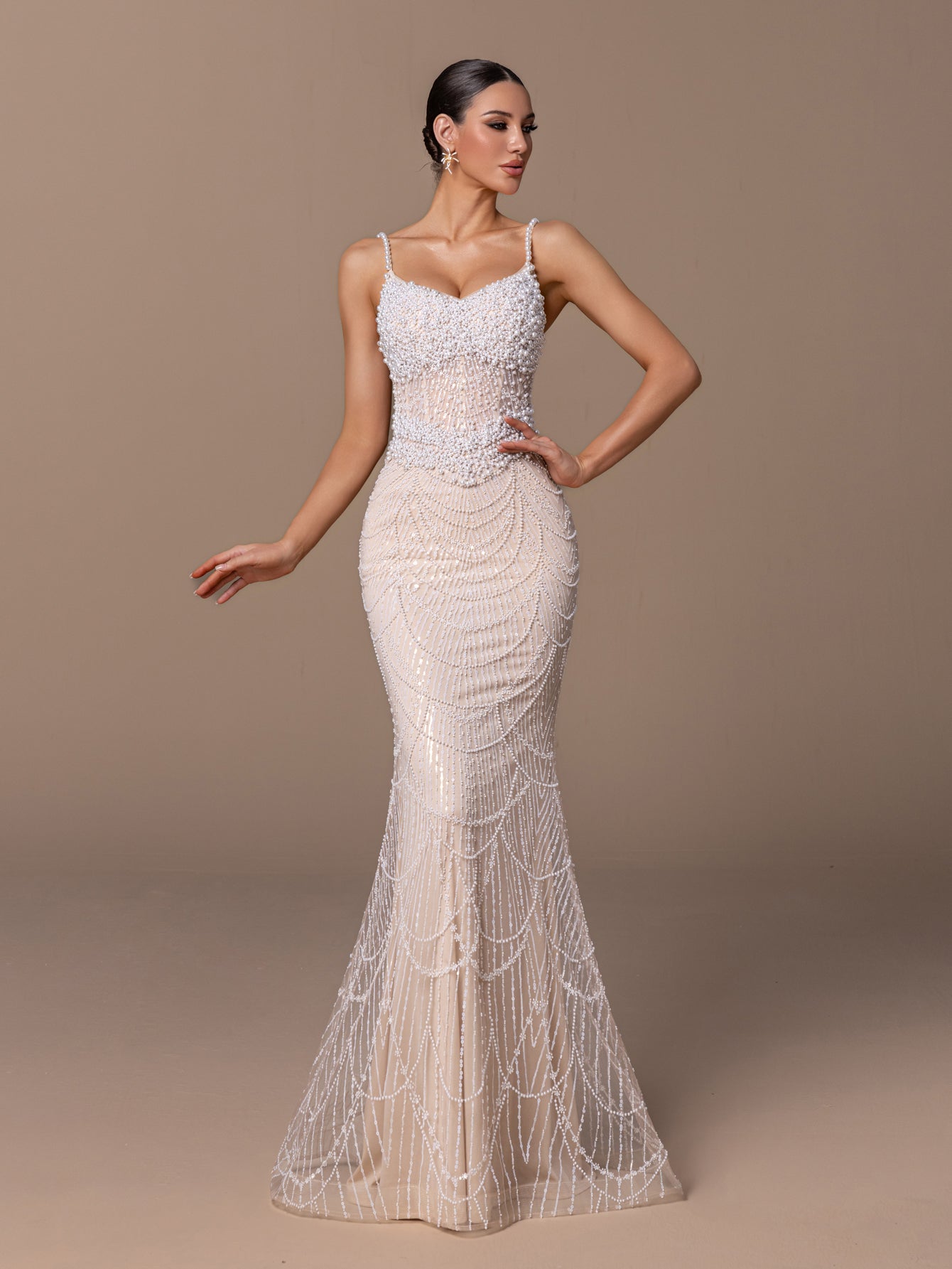 Sleeveless Mermaid Gown with Beaded Sequins, Fan Patterns & Cross-lace-up Back