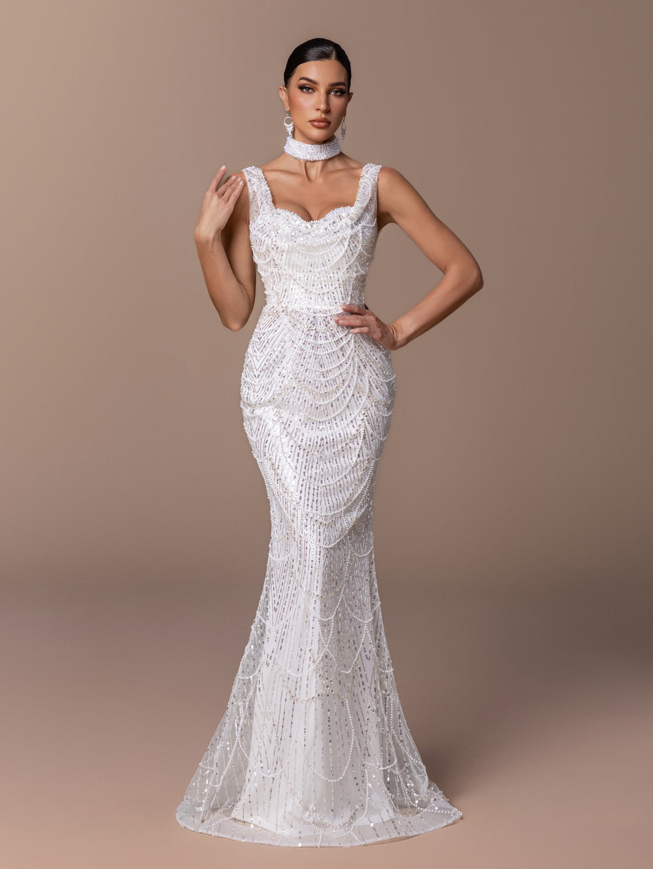 Square Neck Mermaid Gown with Beaded Sequins, Geometric Patterns & Open Back