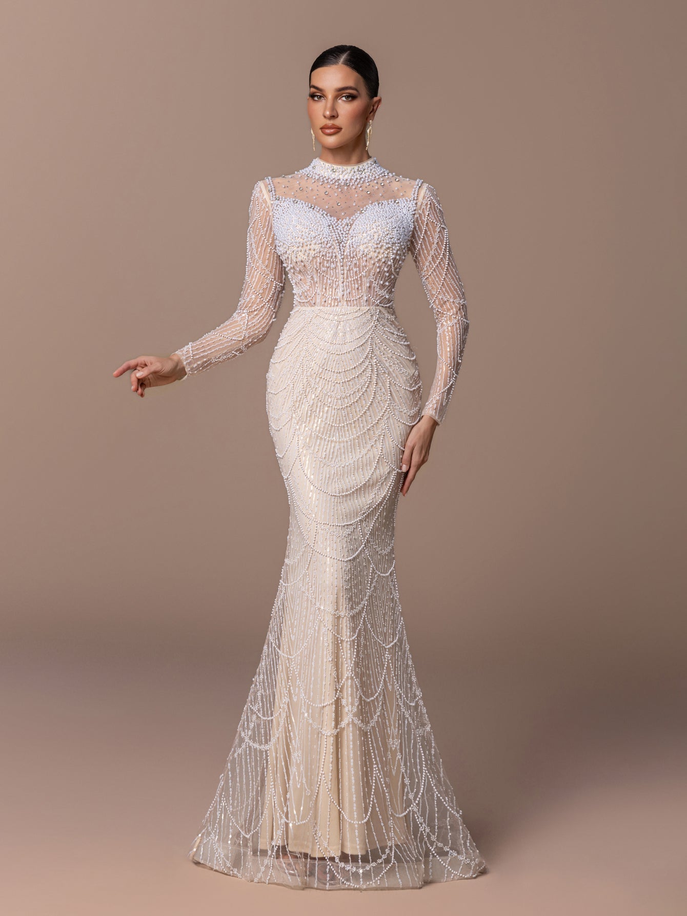 High-Neck Long Sleeve Tulle Mermaid Gown with Beaded Sequin Embroidery
