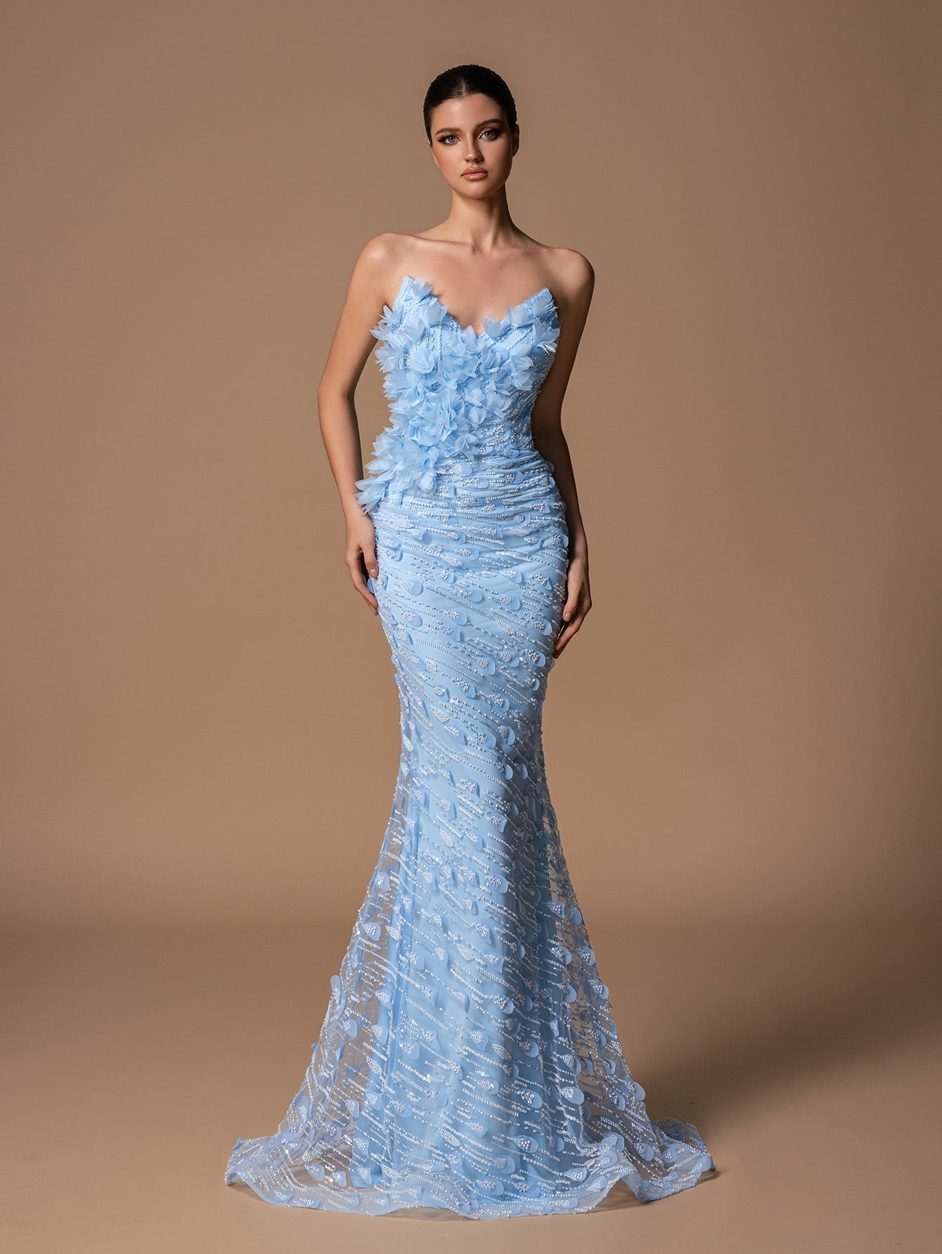 Strapless Mermaid Gown with 3D Floral Details, Crisscross Back & Sequins