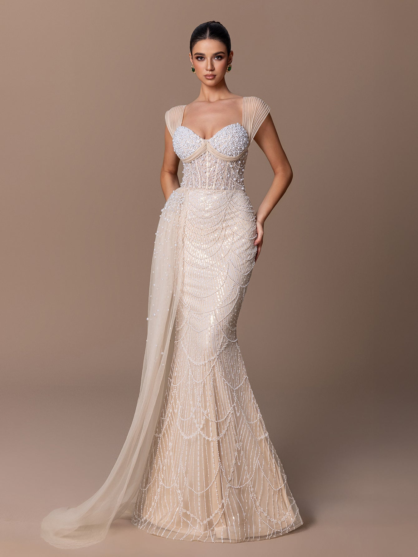 Mermaid Gown with Beaded Sequins, Heart-Shaped Neckline and Tulle Train