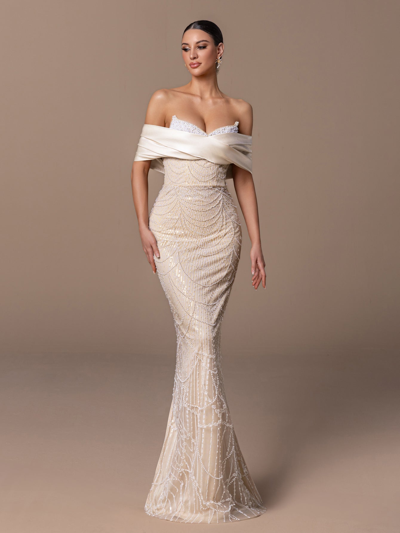 Off-Shoulder Mermaid Gown with Satin Sash, Beaded Fan Sequins & Back Slit