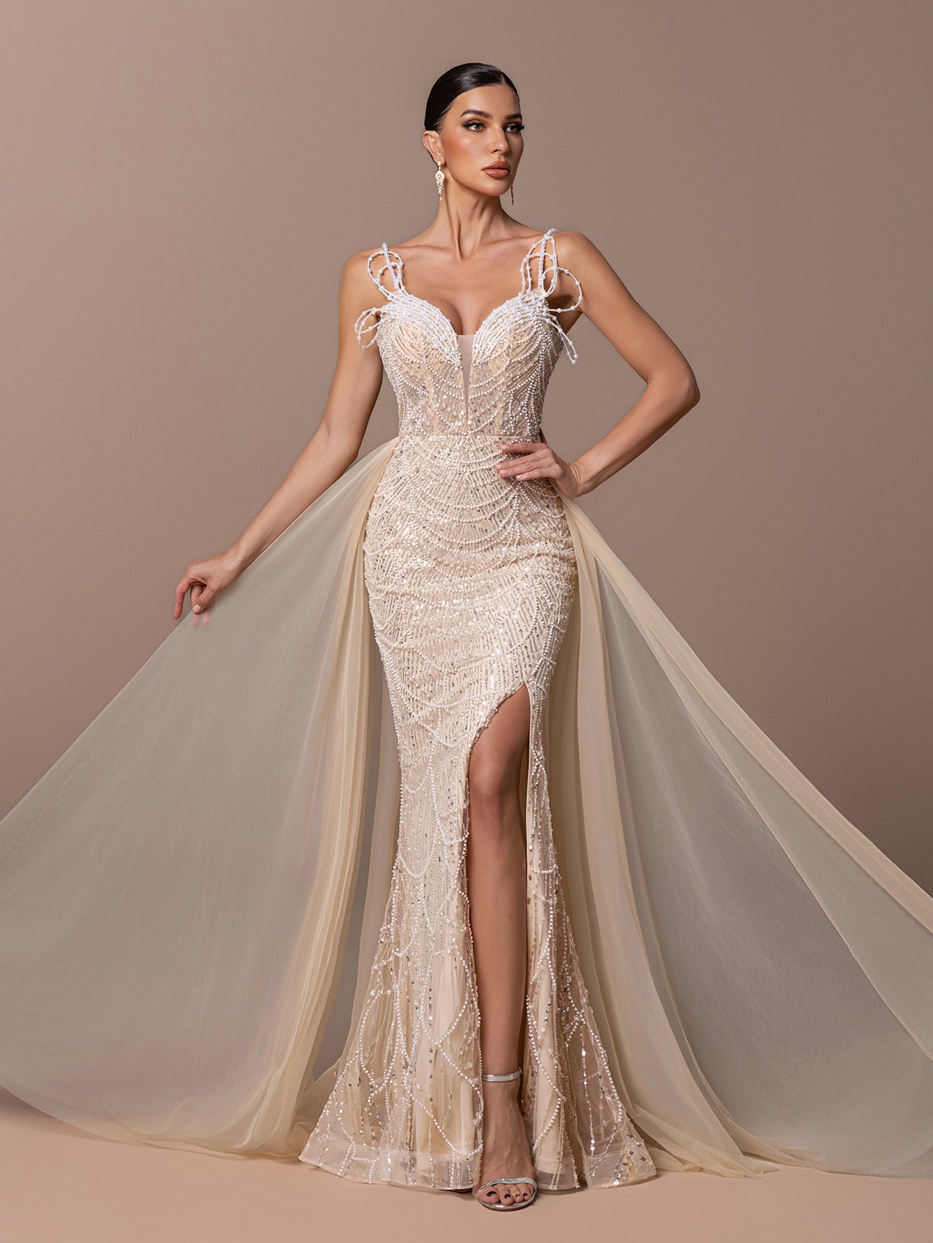 Mermaid Gown with Pearl Straps, Beaded Sequins & Long Tulle Train