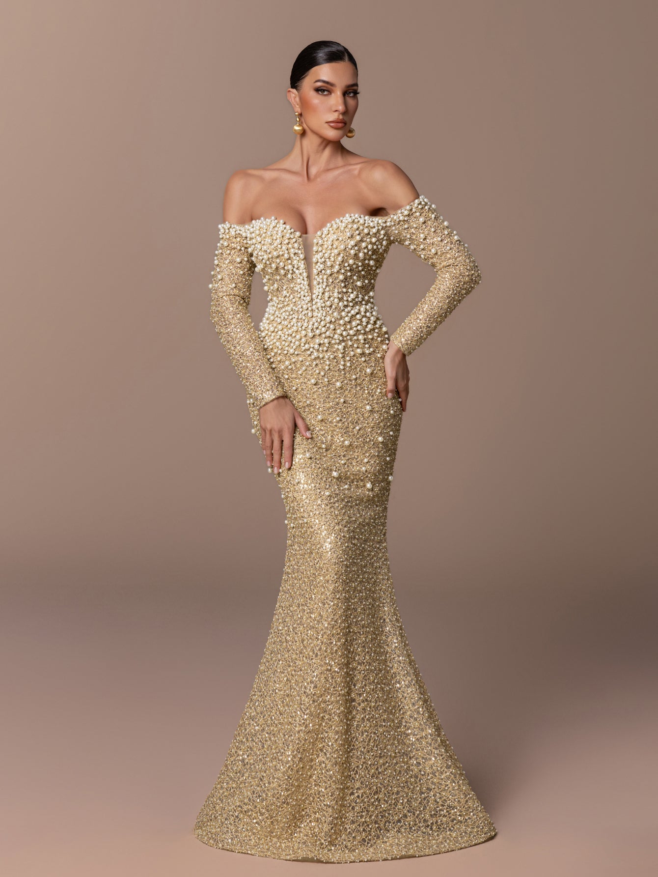 Off-Shoulder Mermaid Gown with Pearl Sequins, Crisscross Lace-Up Back & Long Sleeves