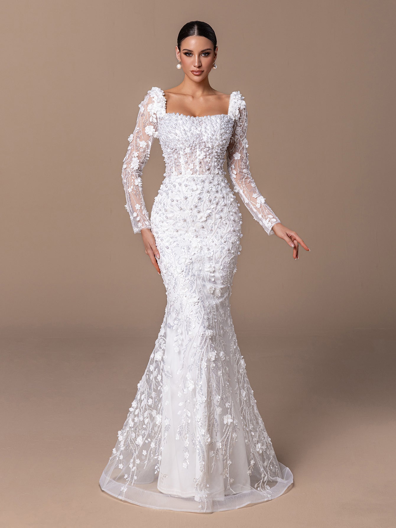 Square Neckline Long-Sleeve Mermaid Gown with Floral Applique & Beaded Sequins