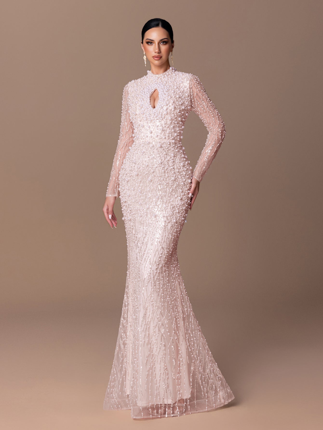High-Neck Mermaid Gown with Beaded Sequins and Sheer Sleeves