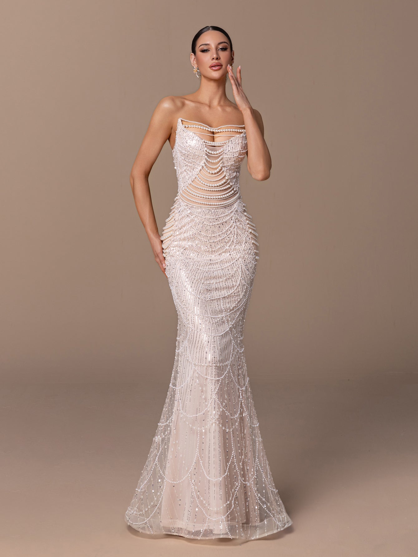 Strapless Beaded Sequin Mermaid Gown with Layered Pearl Chain