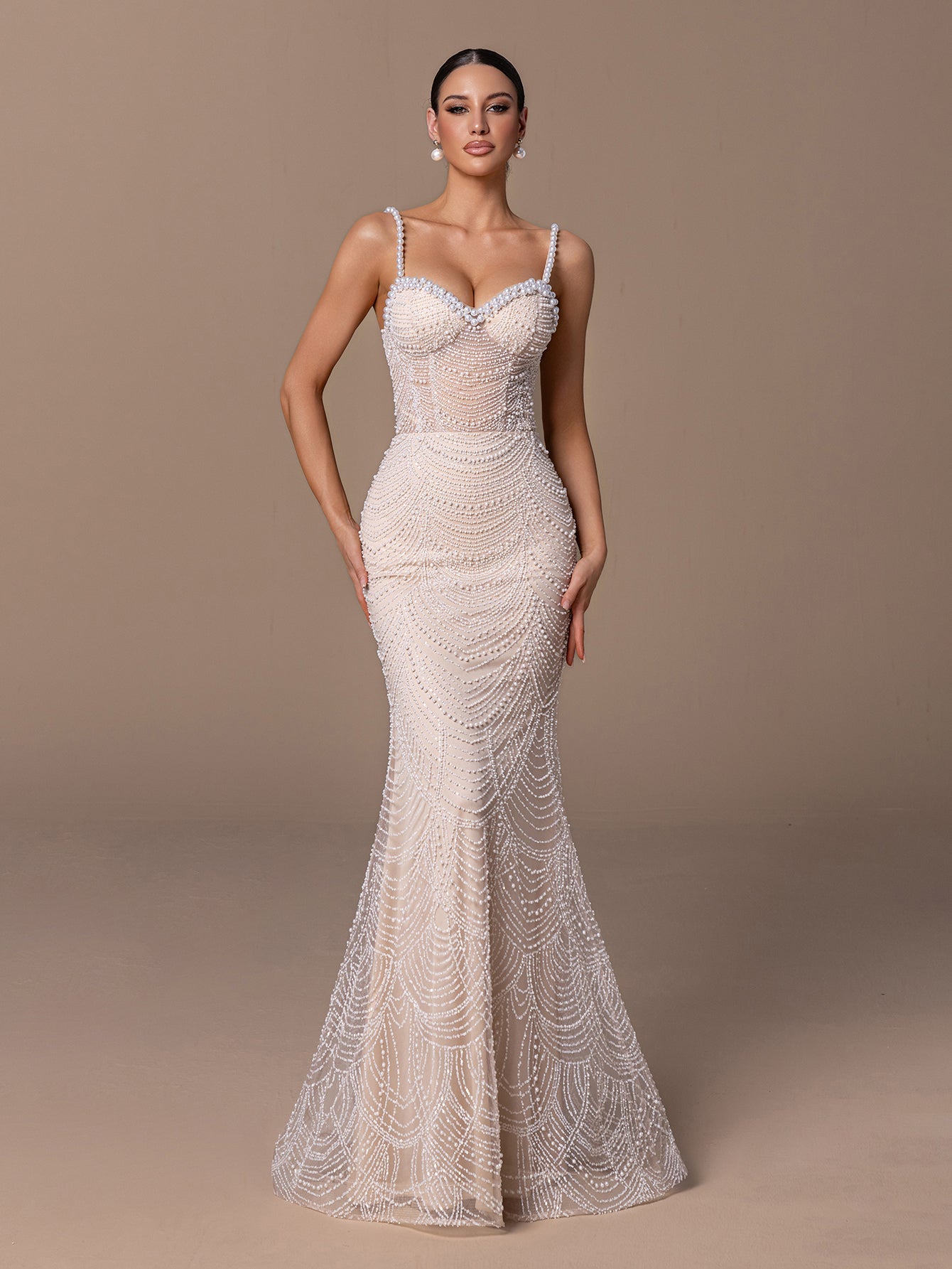 Pearl-Strapped Mermaid Gown with Beaded Sequins & Fan Patterns
