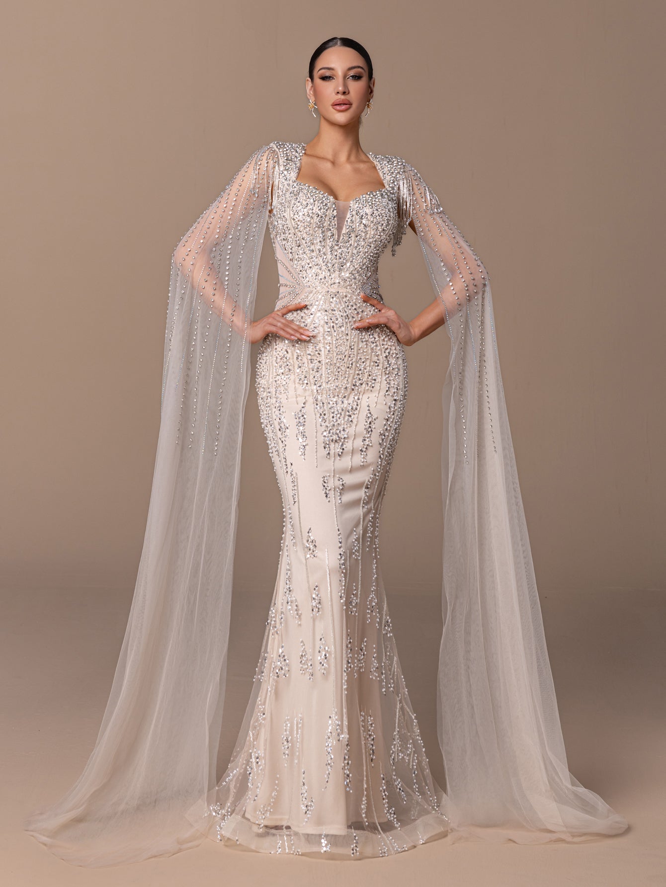 Beaded Sequin Mermaid Gown with Sweetheart-Neckline and Long Tulle Drapes