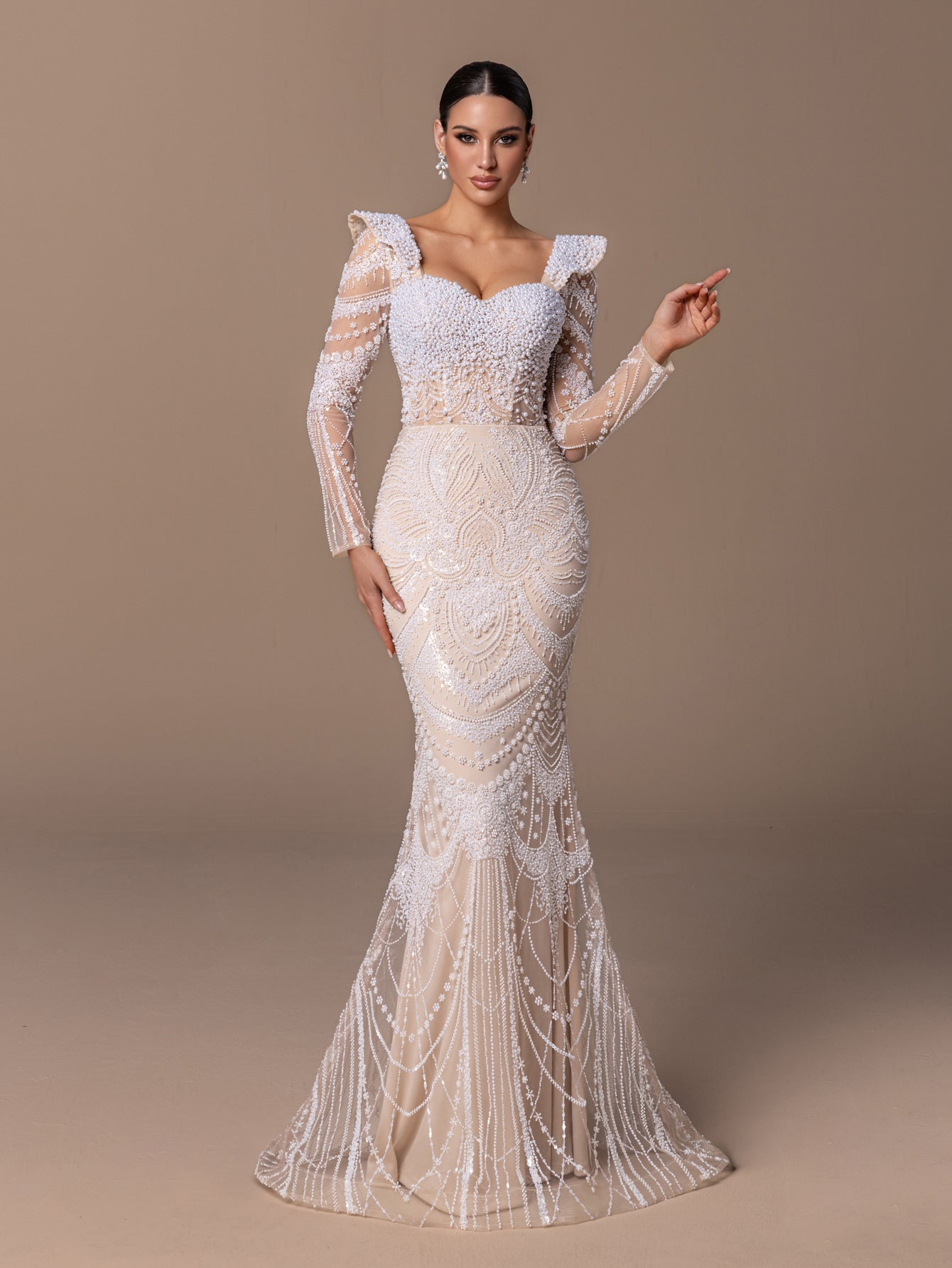 Beaded Sequin Mermaid Gown with Sweetheart-Neckline and Long Sheer Sleeves