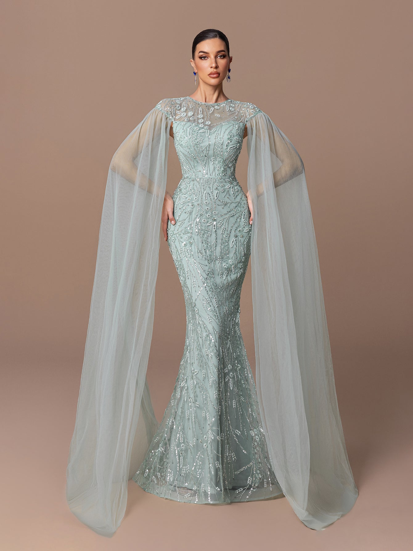 Mermaid Gown with Beaded Sequins Embroidery & Long Sheer Tulle Capes