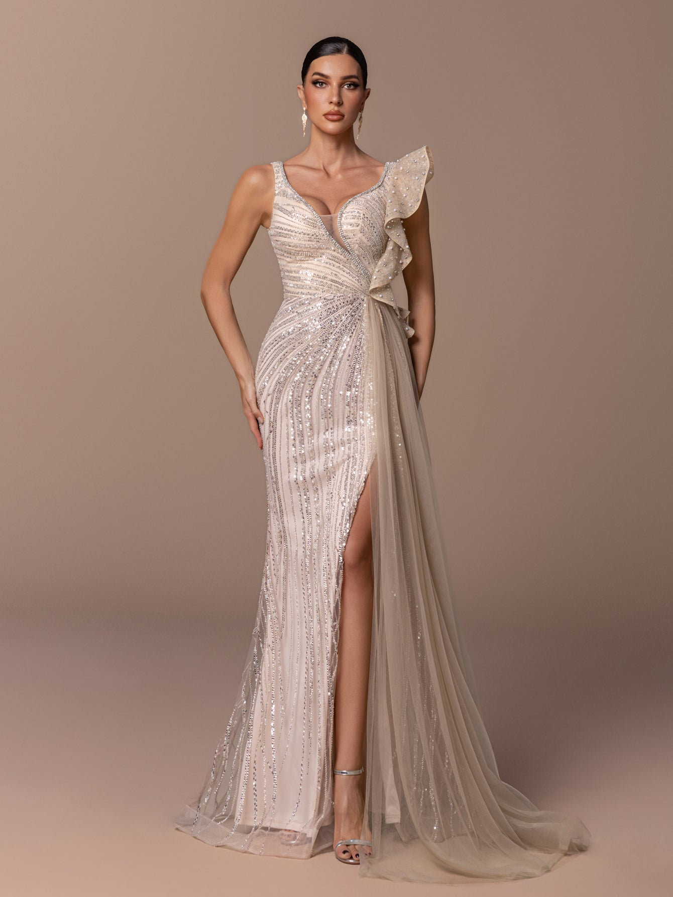 Mermaid Gown with Ruffle Sleeves, Sequins and Tulle Train